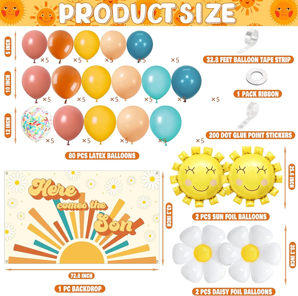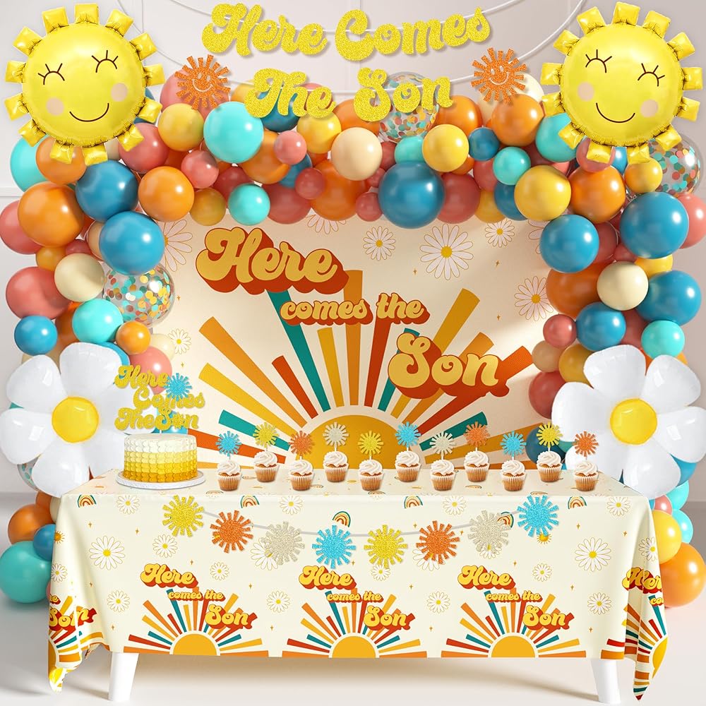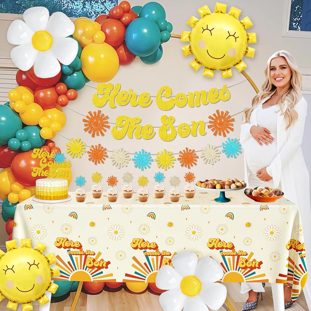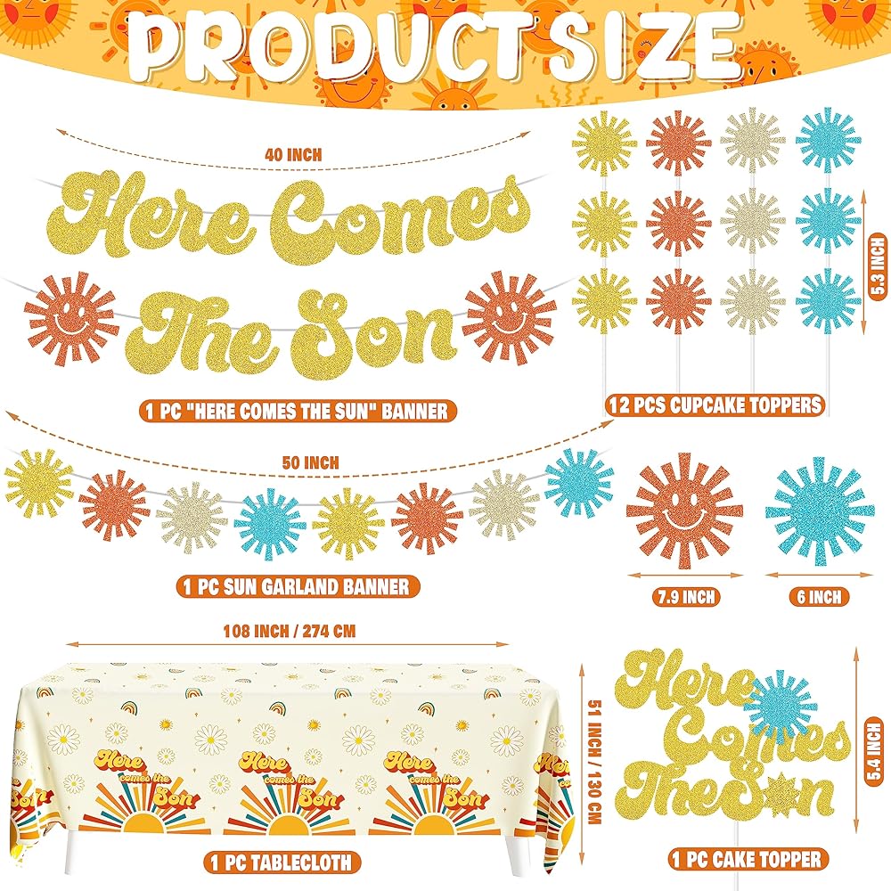 Here Comes the Son Baby Shower Decorations:1 "Here Comes the Sun" banner, 1 sun garland banner, 1 cake topper, 12 cupcake toppers,1 here comes the son backdrop,1 sunshine tablecloth,2 sun foil balloons 2 daisy foil balloons and 80 latex balloons.