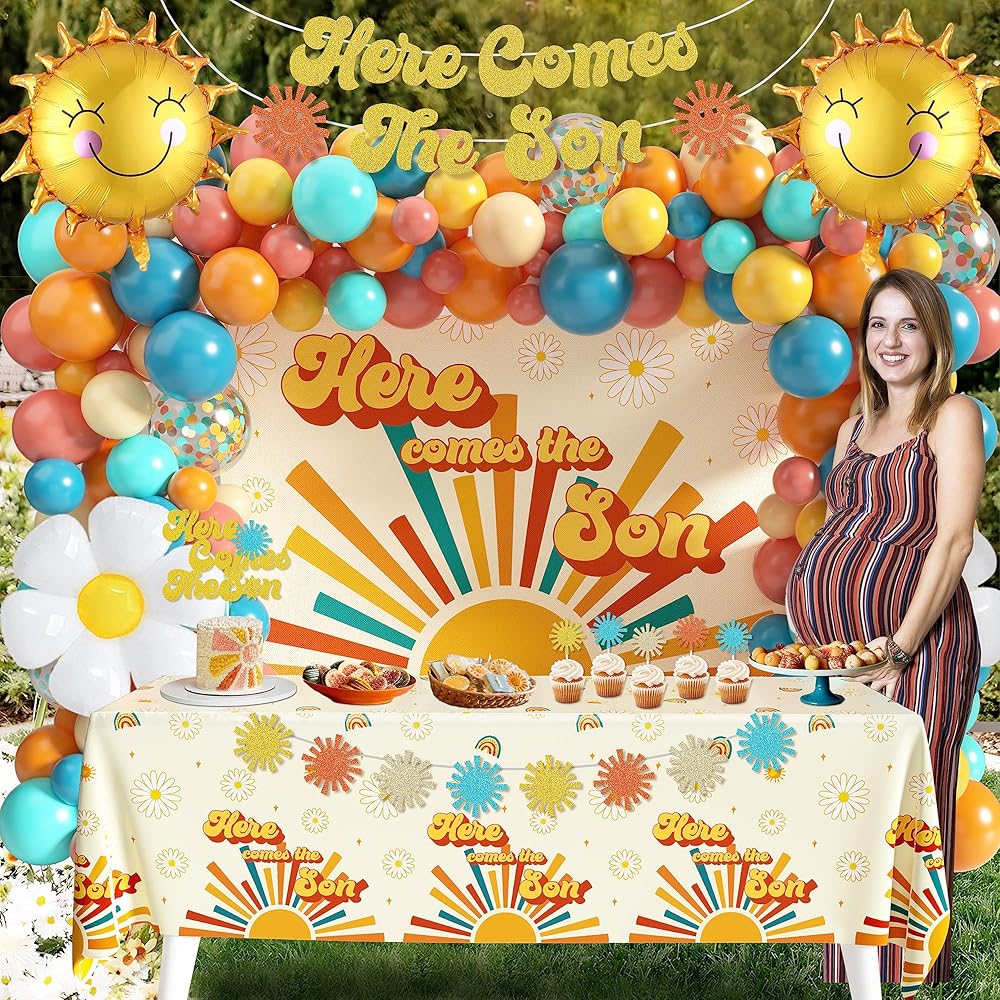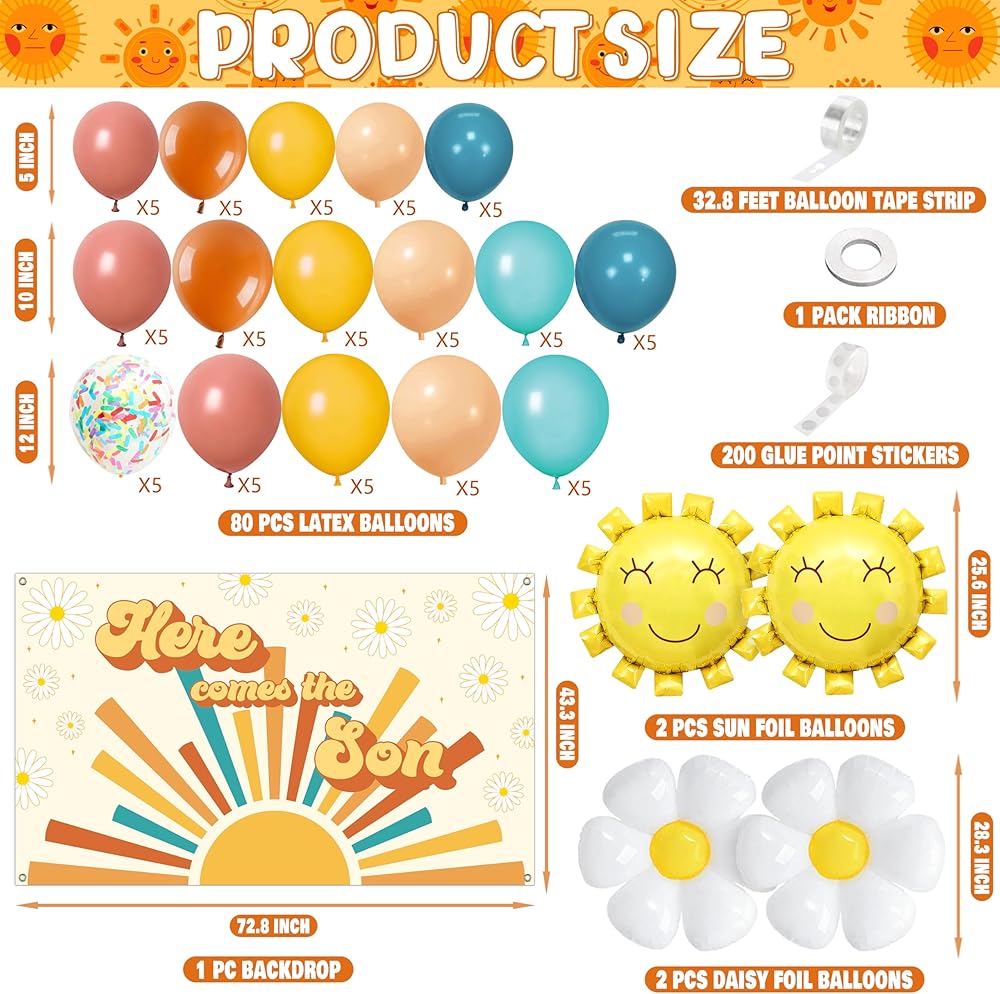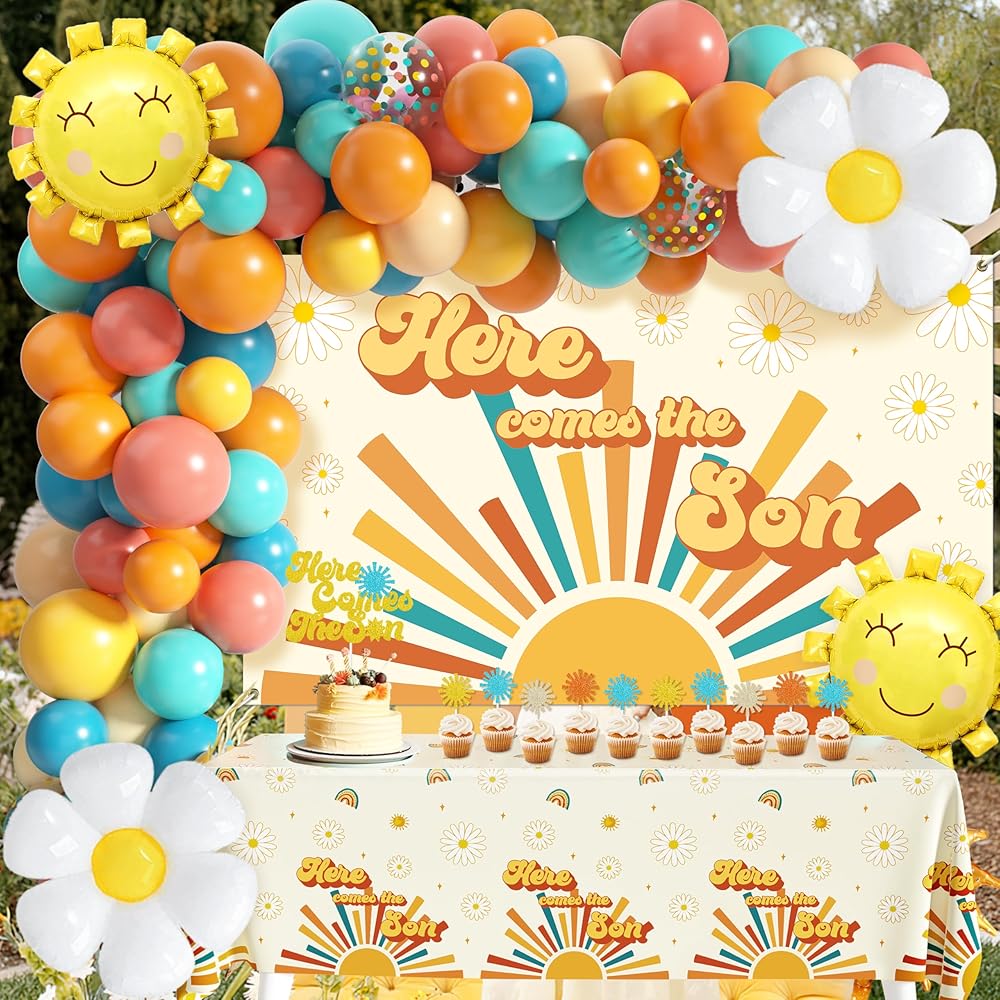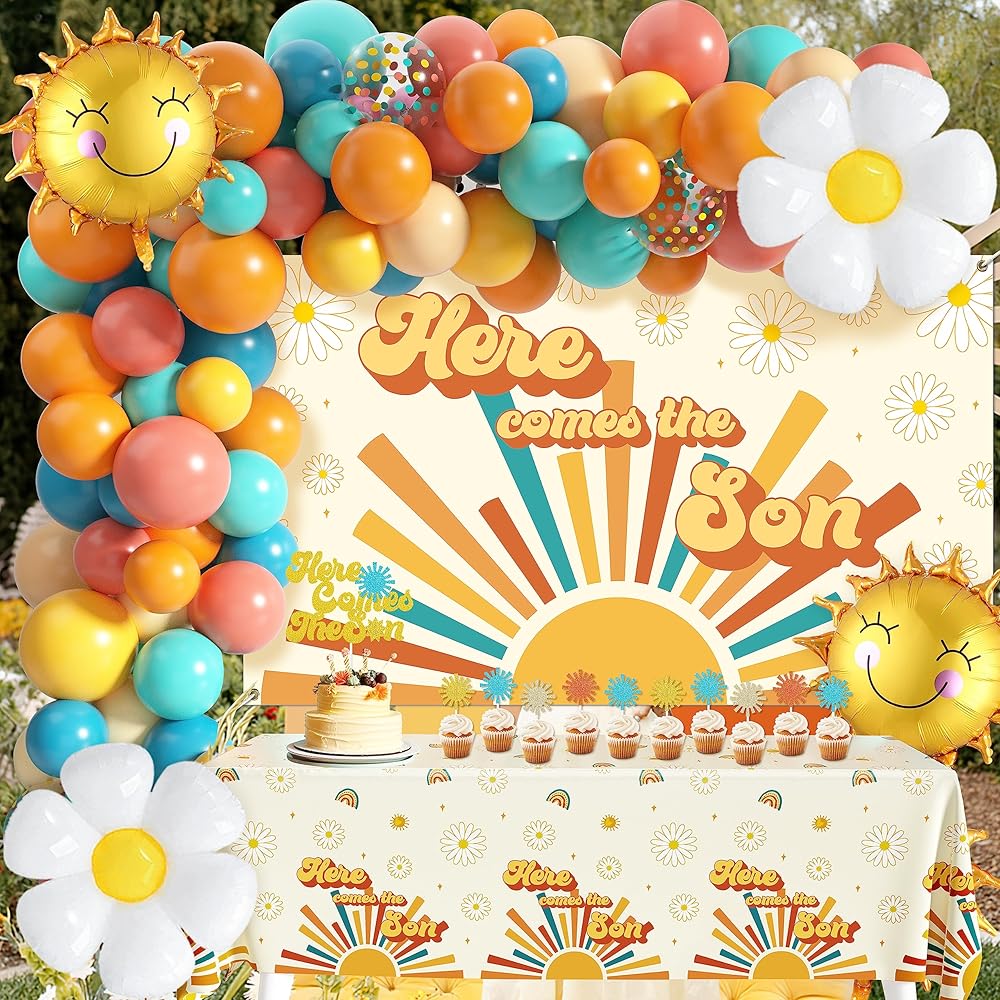 Here Comes the Son Baby Shower Decorations:1 "Here Comes the Sun" banner, 1 sun garland banner, 1 cake topper, 12 cupcake toppers,1 here comes the son backdrop,1 sunshine tablecloth,2 sun foil balloons 2 daisy foil balloons and 80 latex balloons.