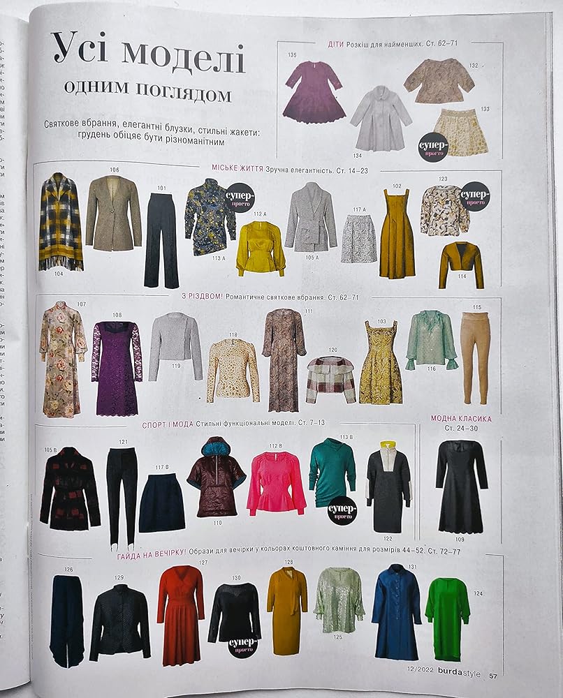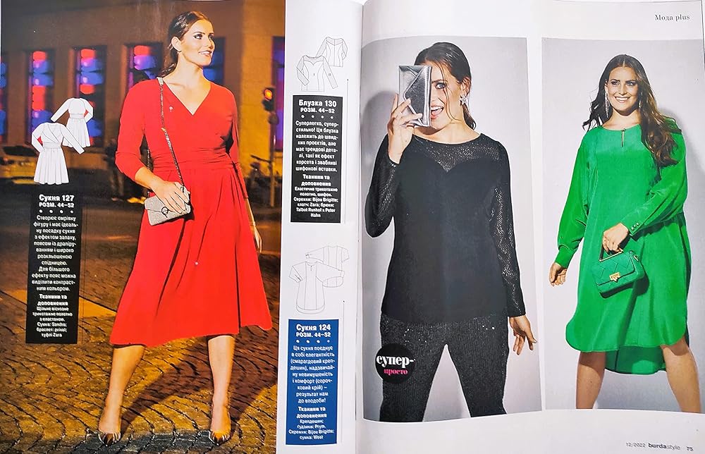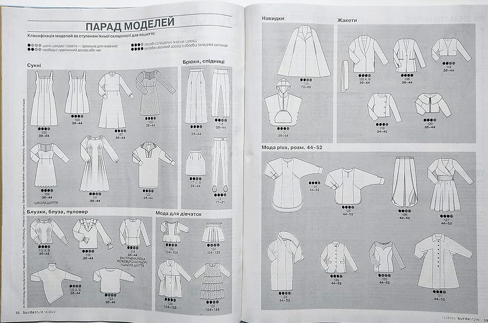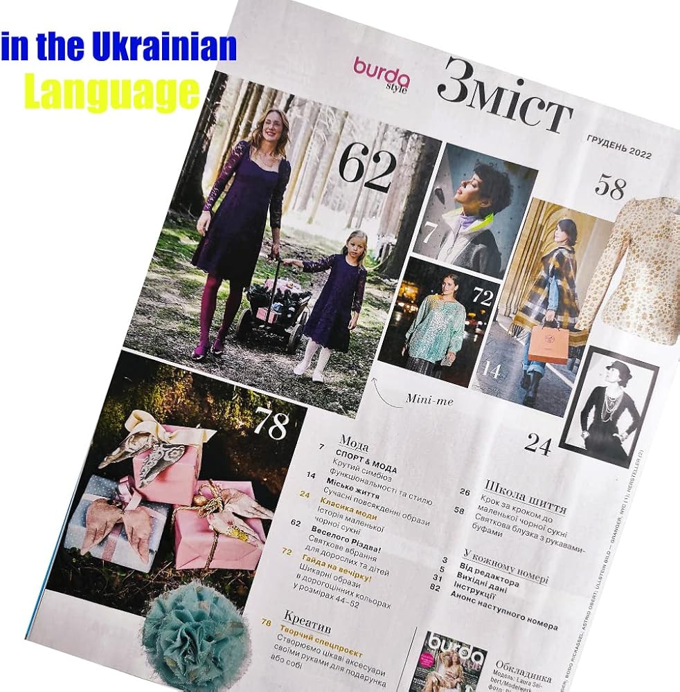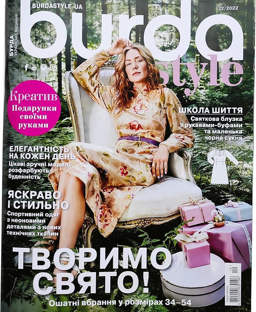 Ukrainian edition of Burda Style Magazine vol.12 (December), 2022. ATTENTION: the Magazine is in the Ukrainian Language. Burda Style magazine with trendy sewing patterns inside: sewing templates for Women sizes 34-44 and 44-52 (Size Plus) and girls sizes 104-128. The magazine consists of 82 pages.