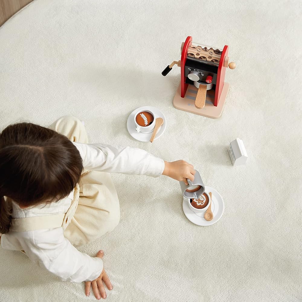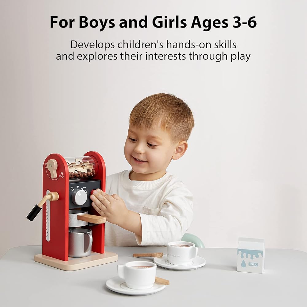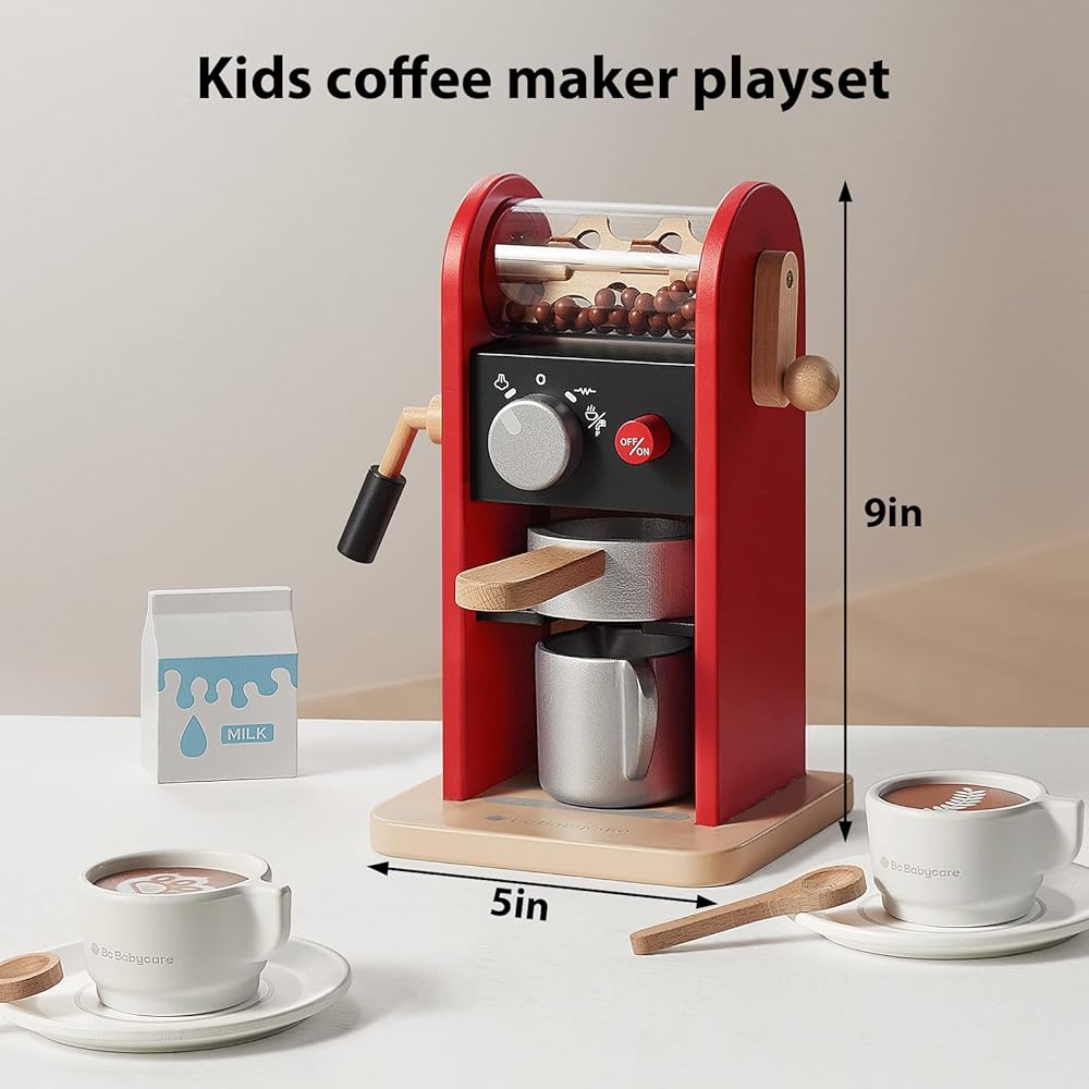 مجموعة ألعاب صانع القهوة الخشبية من بي سي بيبي كير، مجموعة ألعاب واقعية للأطفال من سن 3 إلى 6 سنوات، هدية للأولاد والبنات، هدية إكسسوارات المطبخ، باللون الأحمر