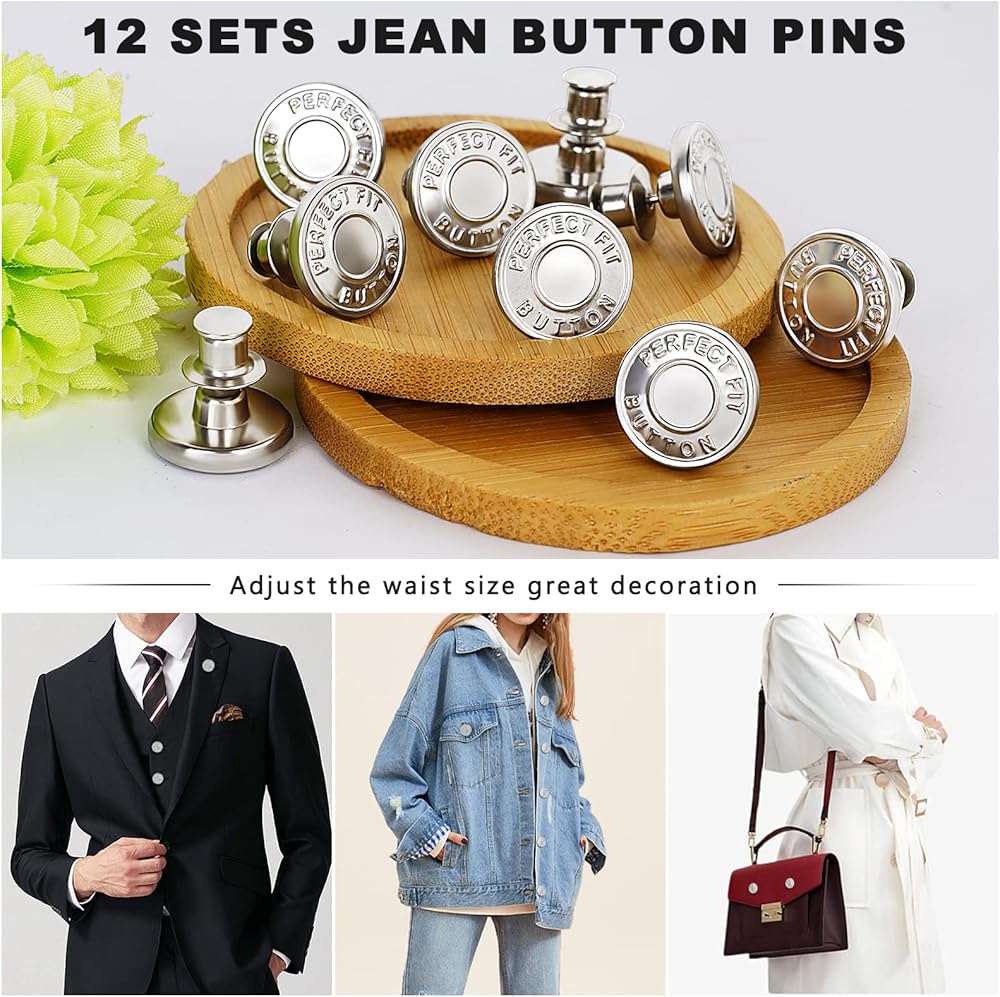 12 Sets Jean Buttons Pins for Jeans No Sew No Tools Reusable and Adjustable,Jean button pins is suitable for jeans, pants, shirt, jacket, hat, bag and so on.