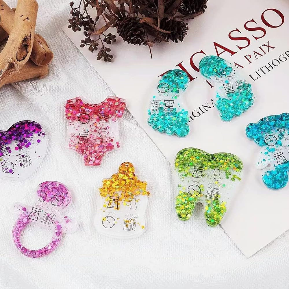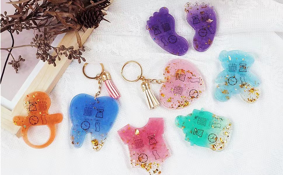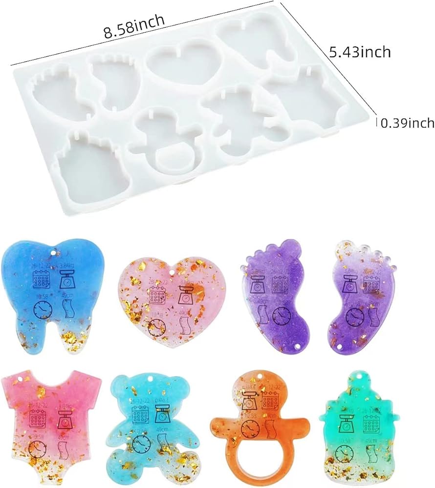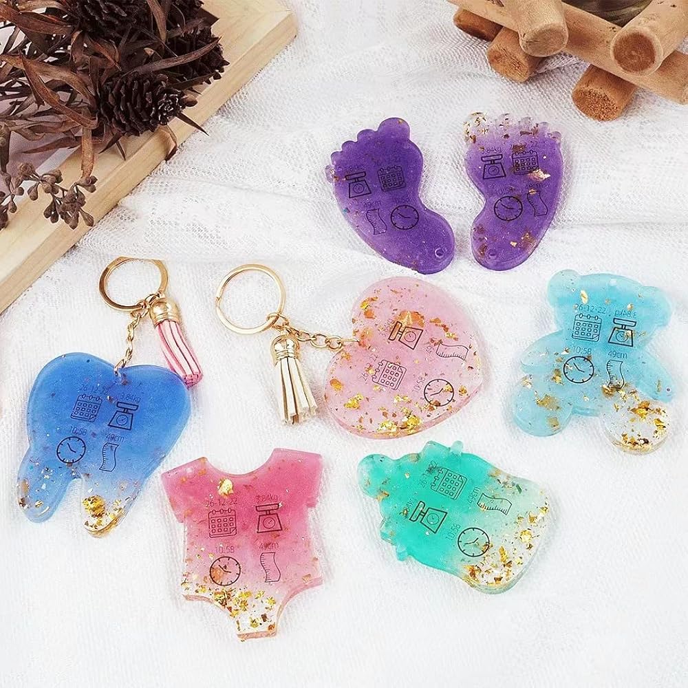 قوالب سلسلة مفاتيح راتنج الايبوكسي: 7 أشكال مختلفة من قوالب السيليكون، بما في ذلك ملابس الأطفال ثلاثية الأبعاد، واللهايات، وبصمات القدم، والزجاجات، والأسنان، والدببة وقوالب السيليكون على شكل قلب.