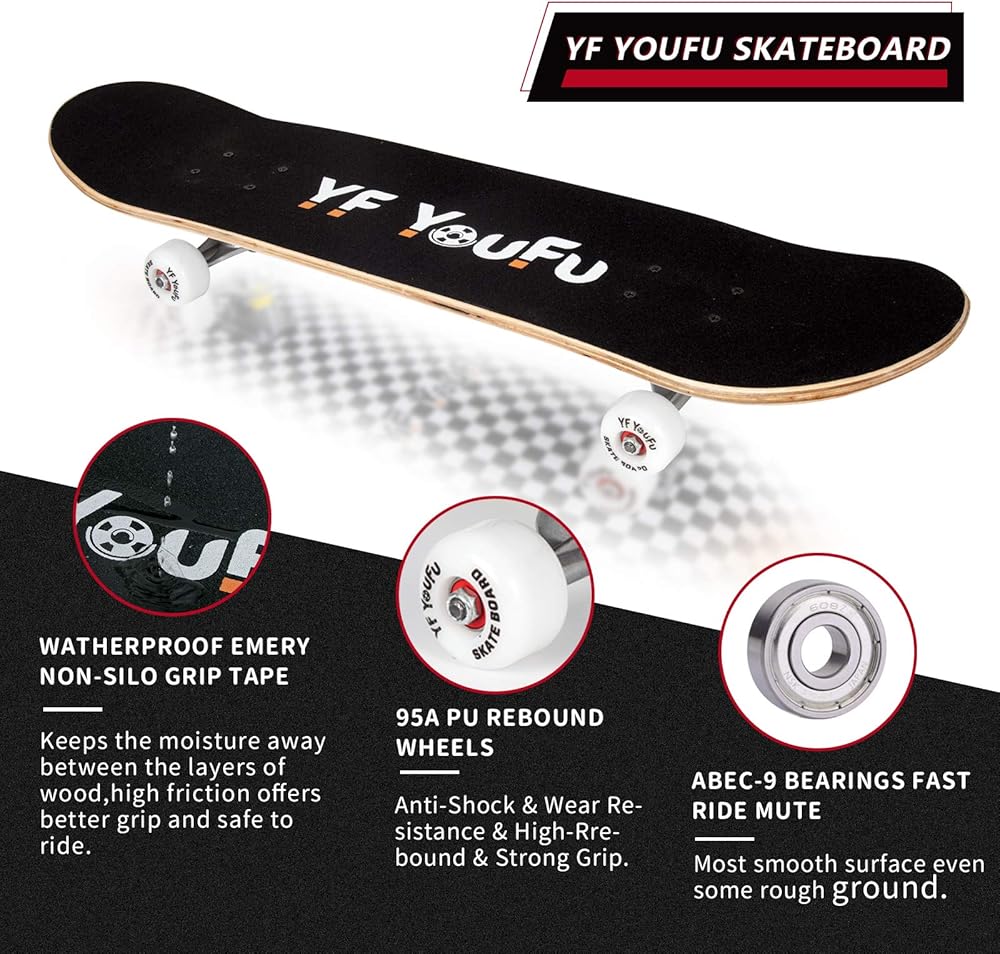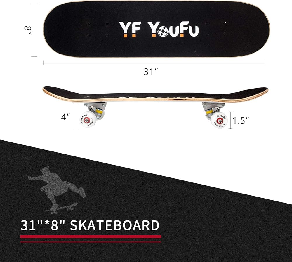 ★لا يتطلب تجميعًا - يأتي مع لوح تزلج كامل مقاس 31 بوصة. يتم فحص جميع منتجات YF YouFu واختبارها بالكامل للتجربة.
