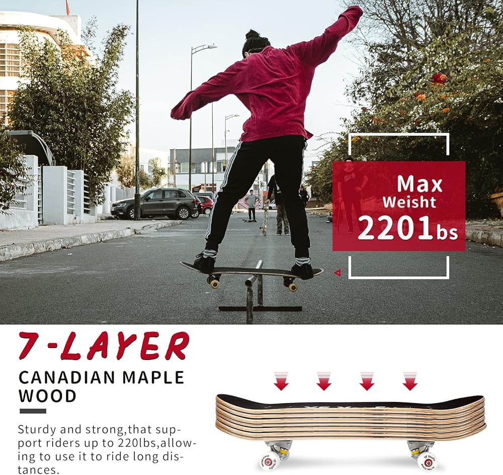 ★متين وآمن - لوح طويل من خشب القيقب مكون من 7 طبقات مع شريط قبضة كامل على الجزء العلوي من السطح، مما يجعله أكثر متانة ويجعلك أكثر أمانًا أثناء التزلج. عظيم للمبتدئين والمهرة