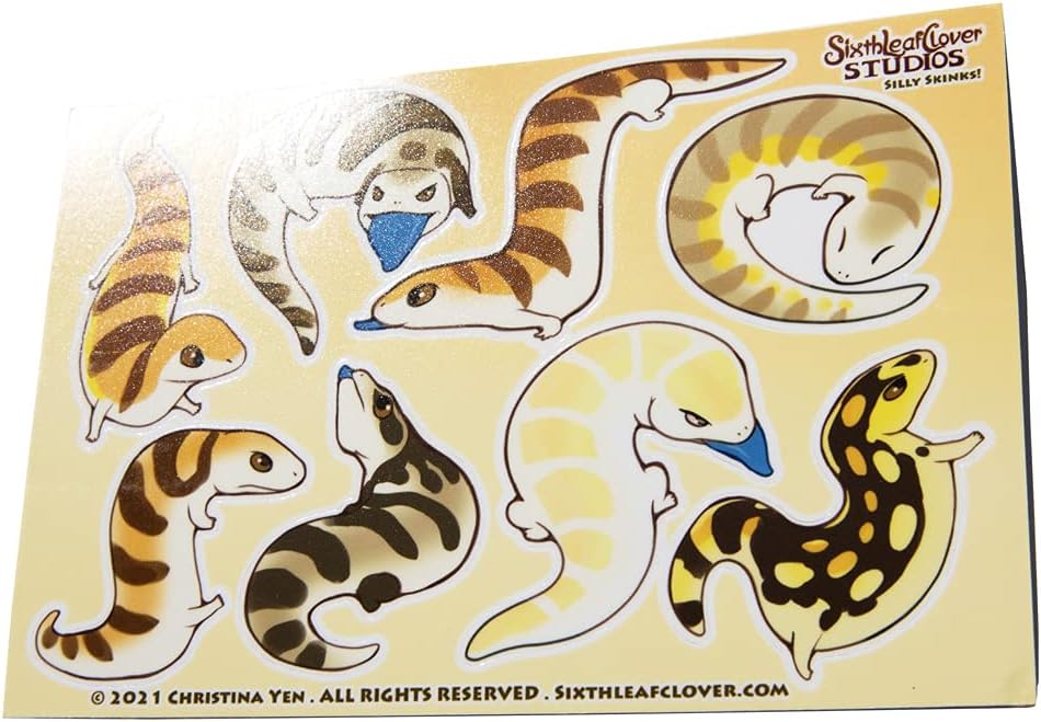 Blue tongue skinks get into just about everything, even places we wonder how they got there! Stick these skinks all over the place! You get 8 stickers in one sheet! Vinyl stickers are crisp full color printed with a heavy duty waterproof laminate (weather/UV resistant coating) that adds 3-5 years of extended outdoor protection. The stickers work well indoors and outdoors.