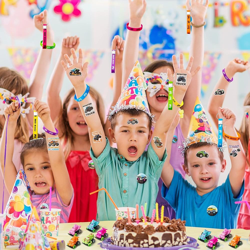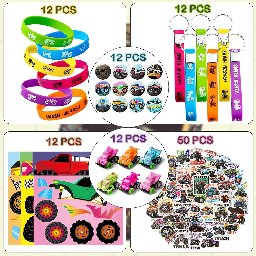 110 قطع من مجموعات هدايا حفلات شاحنة الوحش، هدايا حفلة شاحنة الوحوش مستلزمات الحفلات الكل في واحد تشمل ملصقات شاحنة الوحش، سلسلة مفاتيح، سوار، شارة، سيارة، ملصقات وجه للأولاد والأطفال