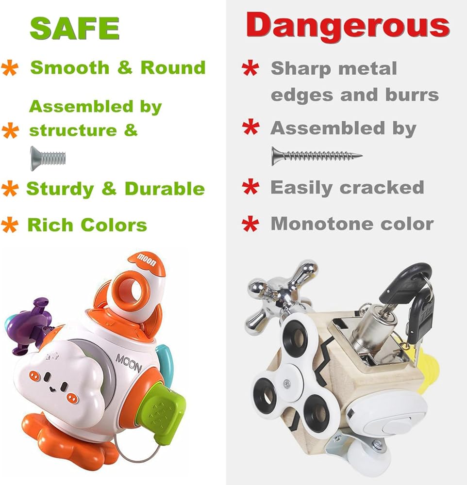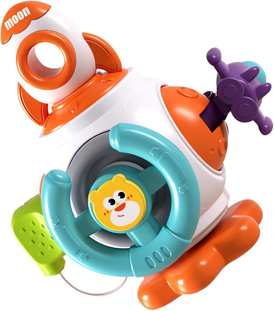 ألعاب مونتيسوري المكعب المزدحم لعمر 1+ 2 3 4 5 سنوات - هذه لعبة لوح مكعب مشغول 6 في 1 من مونتيسوري، تتضمن قابسًا محاكاة، وعجلة قيادة دوارة، وزر ضغط، وصاروخ قابل للتمديد، وسفينة فضاء قابلة للدفع، ودوار دوار. لطيف جدًا، مصمم خصيصًا للأطفال من سن 9 إلى 12 شهرًا و1-2-3-4-5 سنوات من الأولاد والبنات.