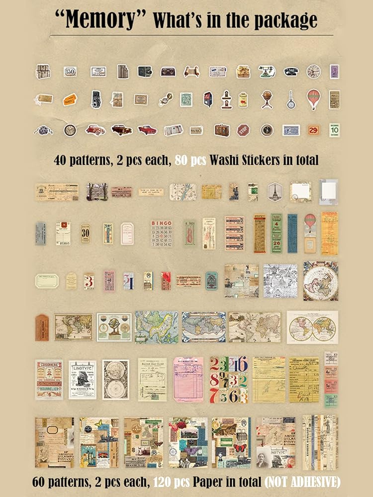 【مجموعة لوازم سجل القصاصات 】-- 200 قطعة من الورق العتيق وملصقات سجل القصاصات، بما في ذلك عبوتين من المواد بأنماط مختلفة، 80 قطعة من ملصقات المجلات غير المرغوب فيها و120 ورق كرافت عتيق (بدون لاصق). كافية لتلبية احتياجات الديكور المختلفة، أو مشاركتها مع العائلة والأصدقاء.