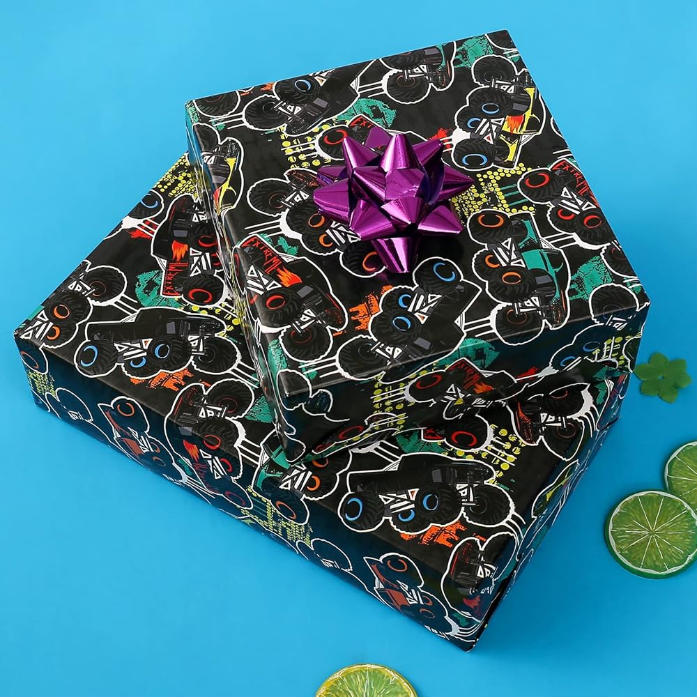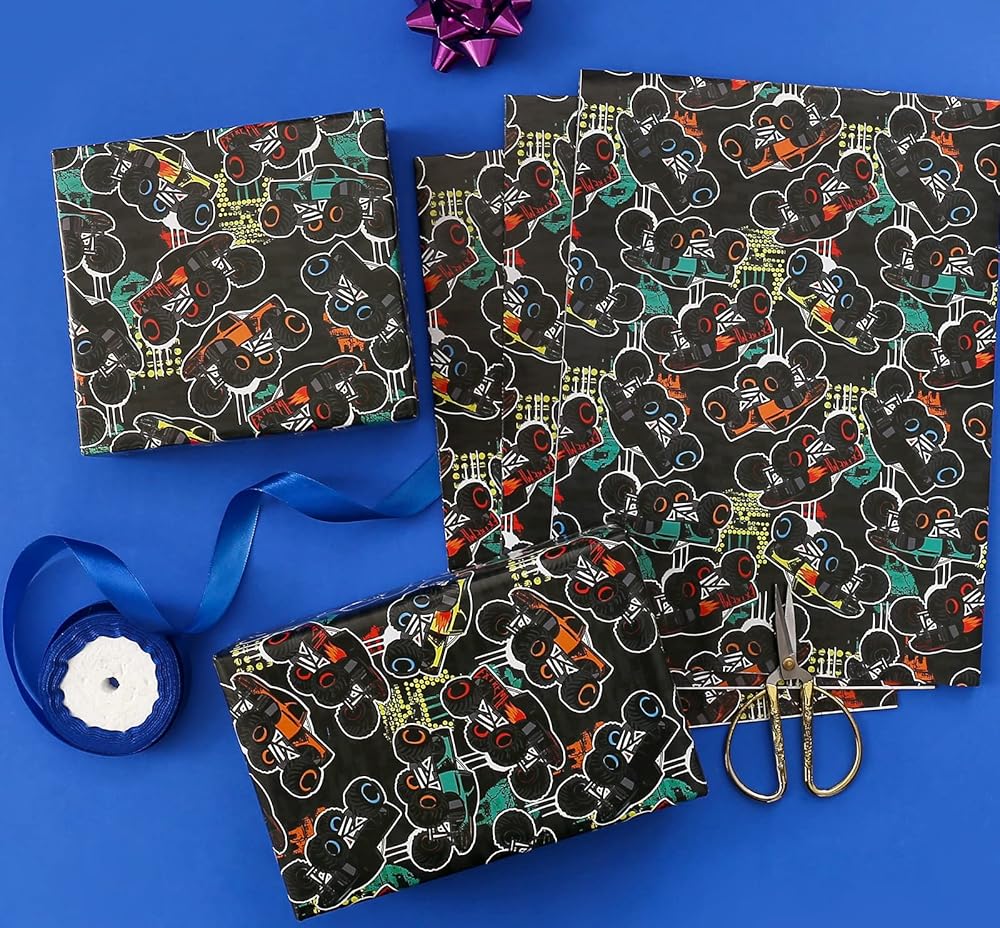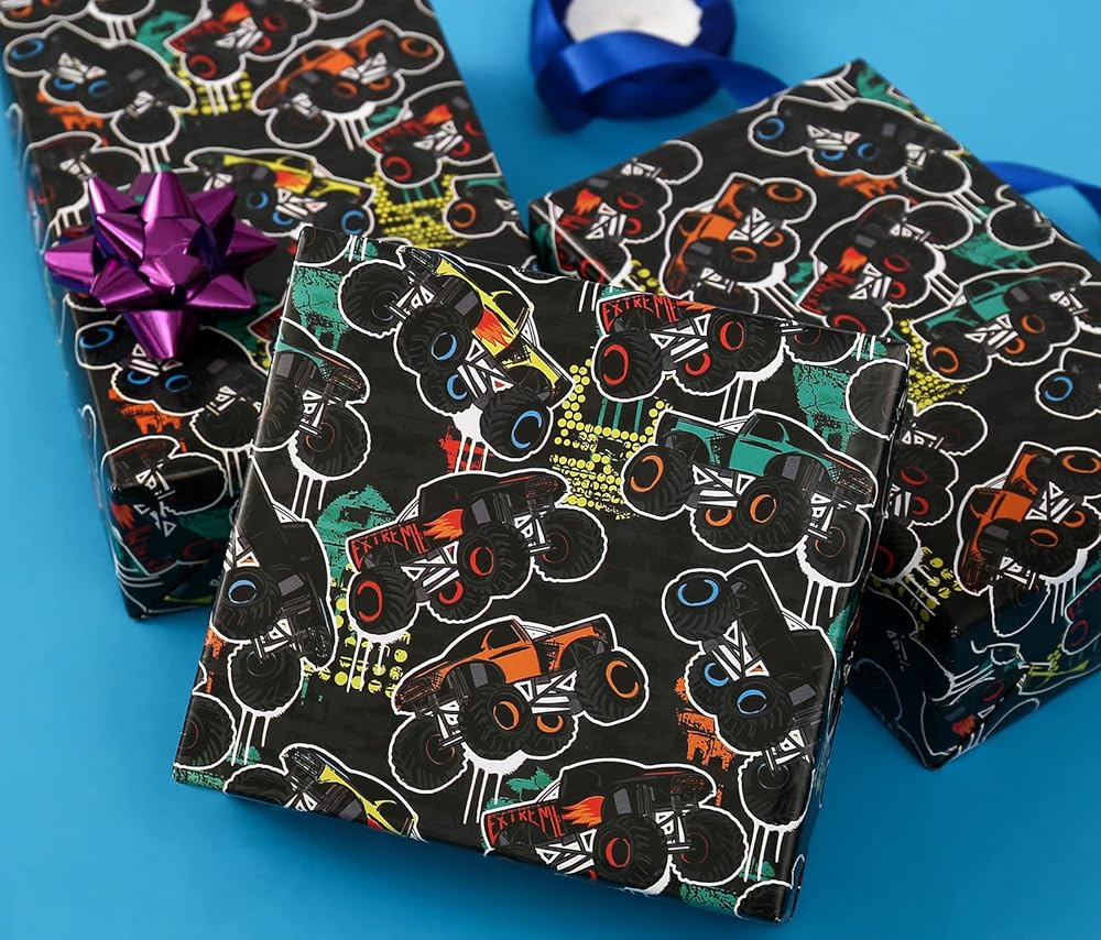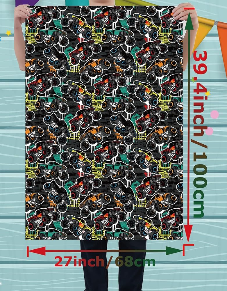 ورق تغليف بتصميم شاحنة وحش كبيرة: ورق تغليف هدايا شاحنة كرتونية رائع لحفلات أعياد الميلاد بطابع شاحنة الوحش أو تغليف هدايا عيد ميلاد الأطفال الأولاد