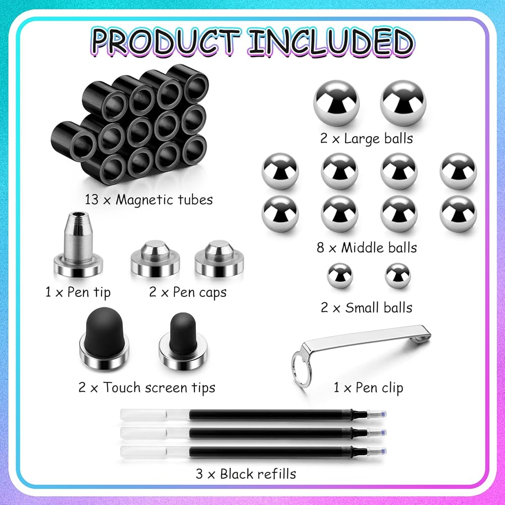 • 【تتضمن مجموعة أقلام فيدجيت】تتكون هذه المجموعة من 13 حلقة مغناطيسية، وكرتين فولاذيتين كبيرتين، و8 كرات فولاذية متوسطة، وكرتين فولاذيتين صغيرتين، وعبوتين حبر أسود، ومشبك قلم واحد، وطرفين لأقلام شاشة تعمل باللمس، وصندوق هدايا واحد.