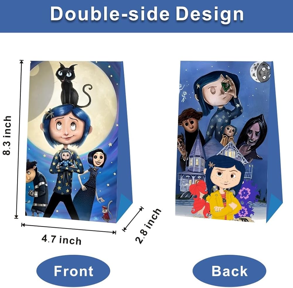 【Perfect Design and Size】The size of Coraline gift bags is 8.3"*4.7"*2.7". All gift bags are sturdy and supported many candies you put inside. Will make your birthday party more fun and colorful, great birthday party decorations.