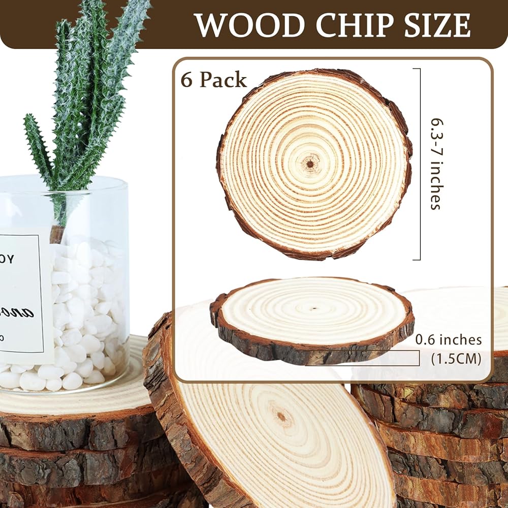اف اس دبليو سي سي كيه 6 قطع من شرائح الخشب غير المكتملة، دائرة خشبية مستديرة 6.3-7 انش مع لحاء شجرة، قطع مركزية خشبية ريفية كبيرة لتزيين طاولة الزفاف والحرف اليدوية