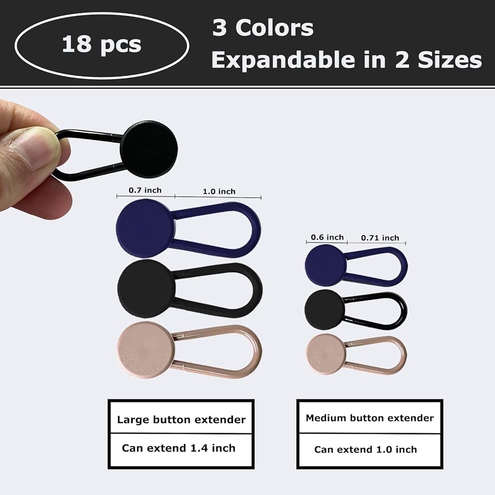 ✔【حجم قابل للتوسيع】- مجموعة موسع البنطلون هذه تأتي بمقاسين من الأزرار، كل مقاس يحتوي على 9 قطع في 3 ألوان مختلفة. يبلغ قطر أحدهما حوالي 0.6 بوصة (يمتد الخصر بمقدار 1 بوصة) والآخر يبلغ قطره 0.7 بوصة (يمتد الخصر بمقدار 1.4 بوصة). يمكنك اختيار موسع أكثر ملاءمة لمحيط خصرك، والزر يجعل خصر البنطال أكبر وأكثر راحة.