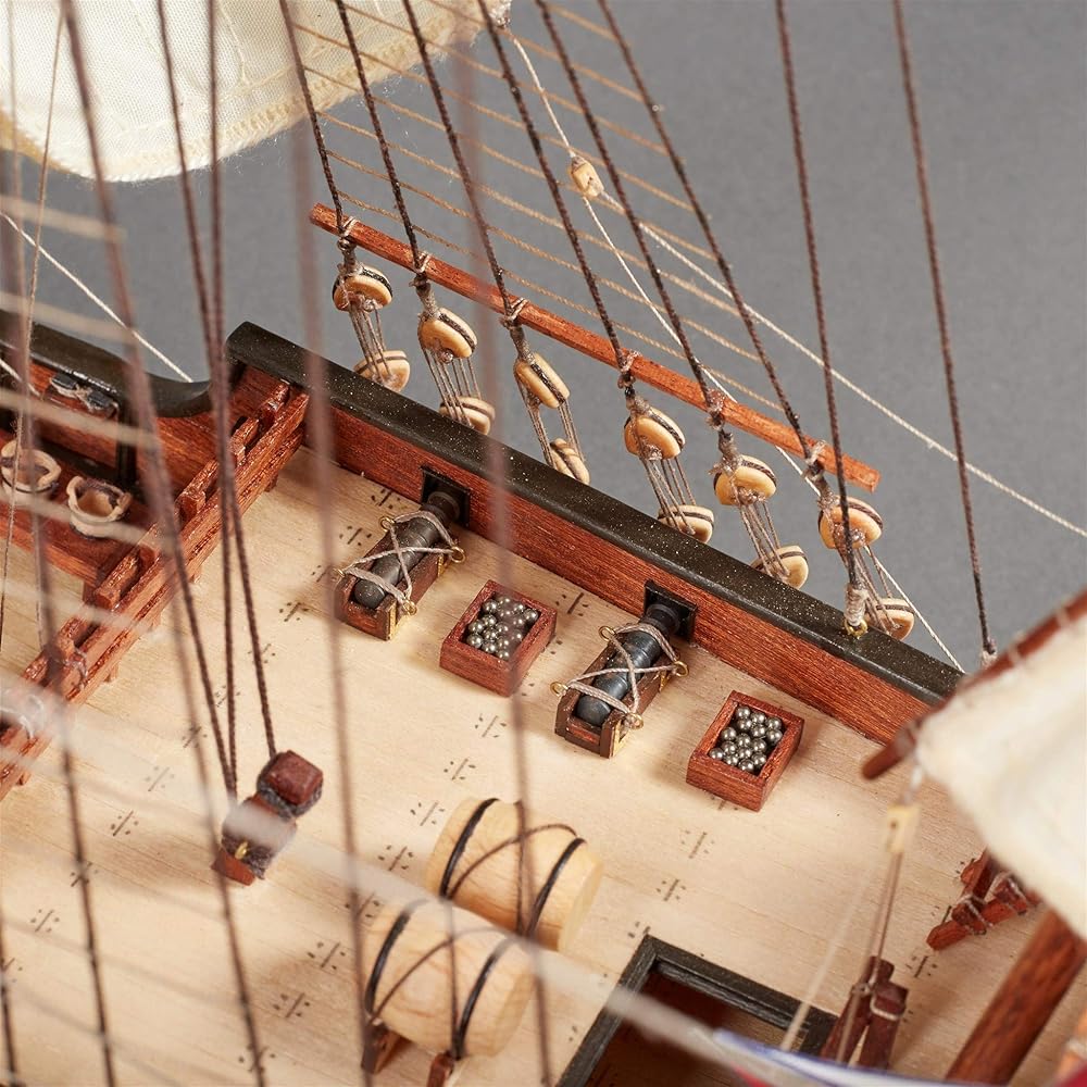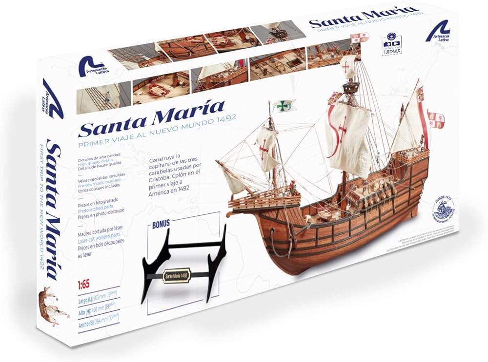 Renovated wooden model of the Santa María (nao) 1/65 scale. The 2020 modelling kit for advanced model makers includes birch wood, die-cast pieces and photo-etched details, hand-stitched candles and a wooden base with a nameplate. Once completed, this faithful replica has the following dimensions: 50.3 cm long / 26.4 cm wide / 49.8 cm high.