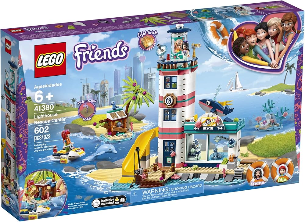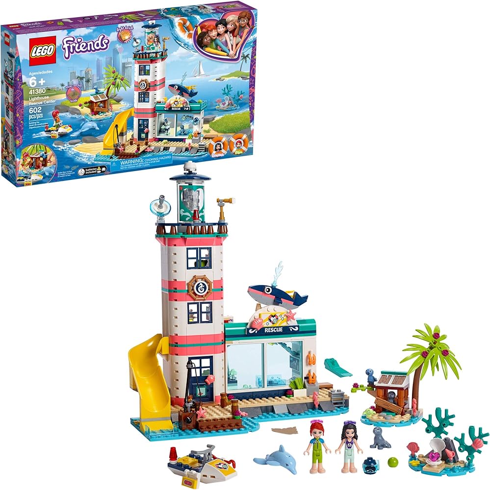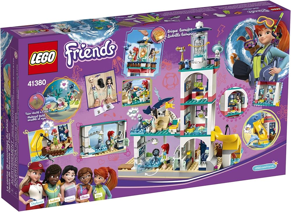 Let your kid get totally immersed in adventure action play with LEGO Friends 41380 Lighthouse Rescue Center playset. This rescue center toy has a multitude of features, including a lab, sea lion play area, rest area, TV room, office and an observation deck with a lamp that can be lit by pressing the lighthouse roof. Rescued sea lions access the LEGO lighthouse clinic using a clever hinged pool that swings through 180 degrees to bring the sea lions into the clinic. Also included is a water scooter for rescuing the sea animals and a mini island where the sea lion is trapped in an abandoned shack, which has a fun button function your child can push to set the sea lion free. There is also a treasure map hidden there—the clever textile reveals its secrets when brushed with water. This rescue mission toy provides a raft of scenarios that allow imaginations to run free and nurturing play to come to the fore. Give any LEGO builder an amazing building experience with Instructions PLUS, available in the LEGO Life app for smartphones and tablets. The easy-to-use, intuitive building instructions let them zoom, rotate and visualize their creation using the special ghost mode as they go. Instructions PLUS is also great for younger builders, guiding them through the building process for a greater sense of independence and achievement. This fun construction set includes 2 mini-dolls: LEGO Friends Mia and LEGO Friends Emma, plus 5 animal figures.