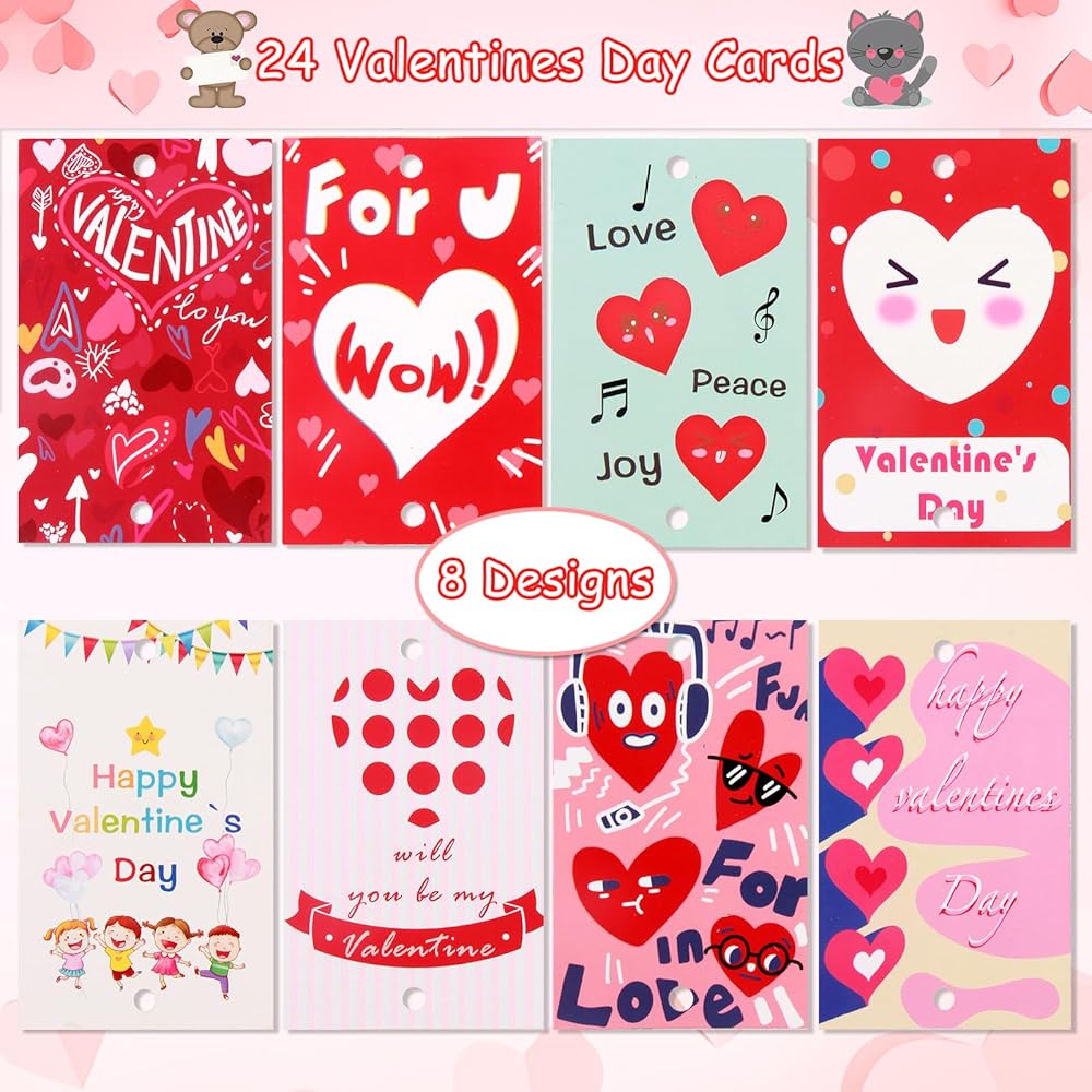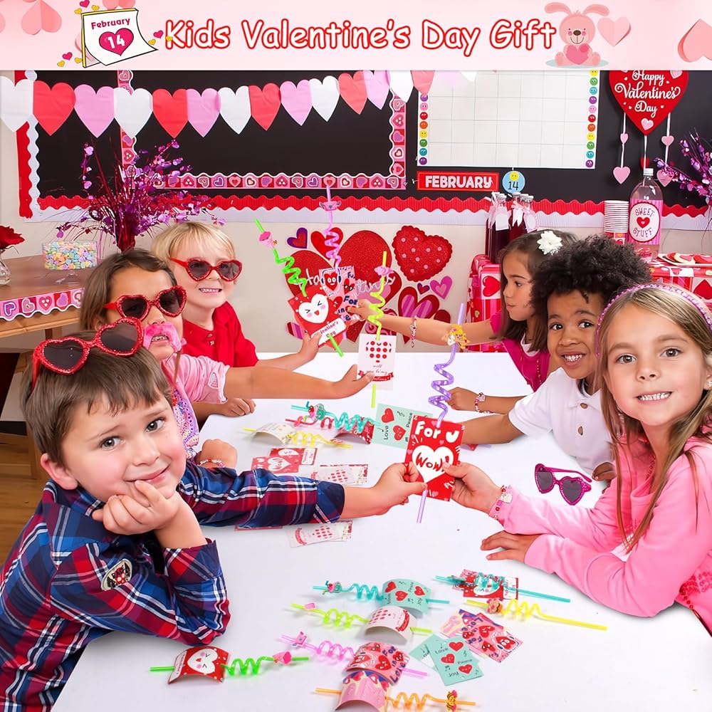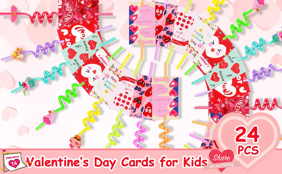MAIAGO 24 عبوة من شفاطات الشرب القابلة لإعادة الاستخدام في عيد الحب مع قطعتين من فرش التنظيف و24 بطاقة لتبادل الفصول المدرسية للأطفال، هدايا حفلات عيد الحب للأطفال، حشوات لحقائب عيد الحب، 8 أنماط