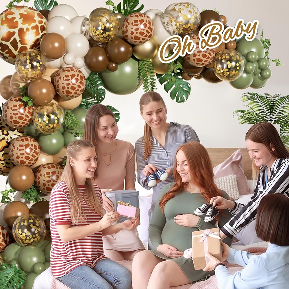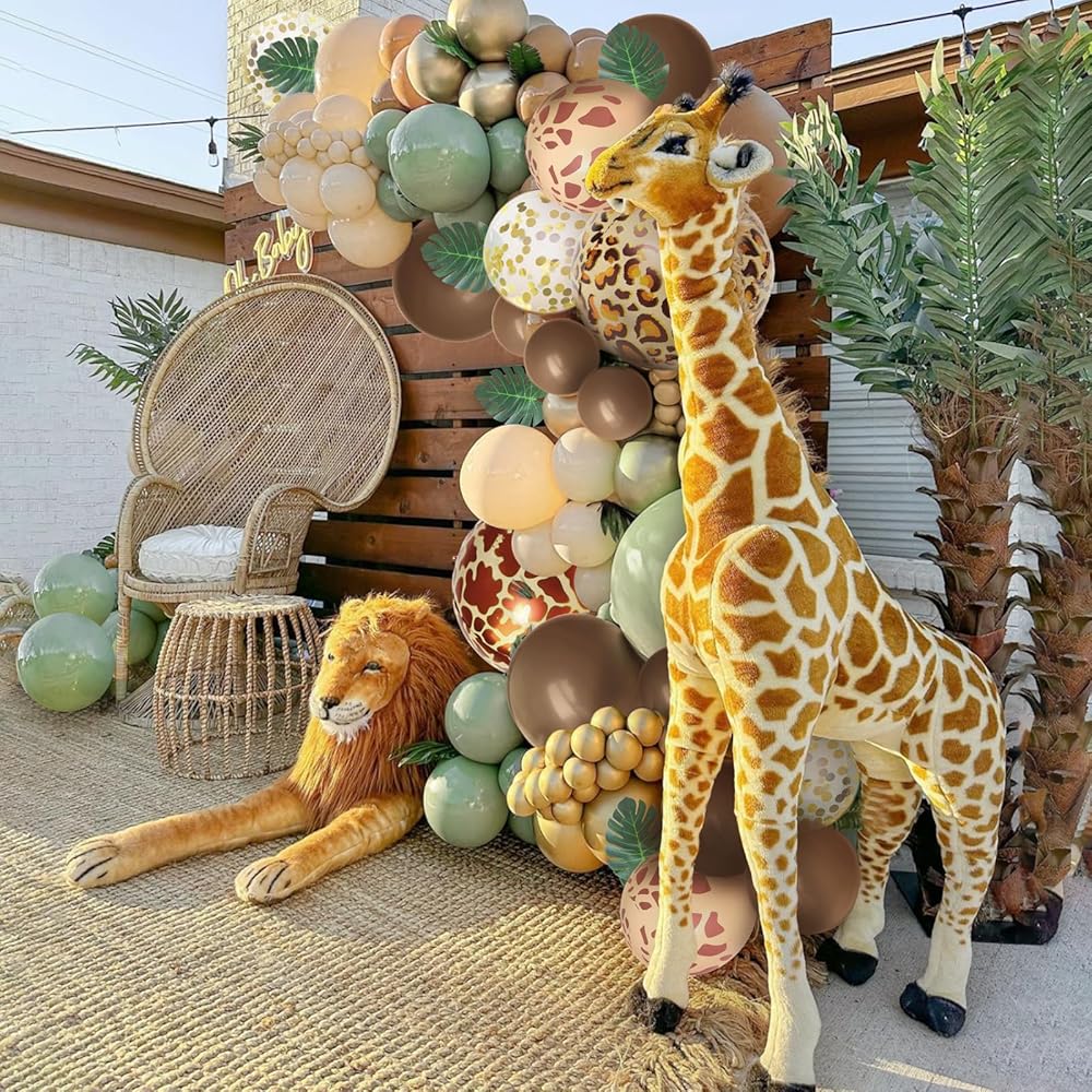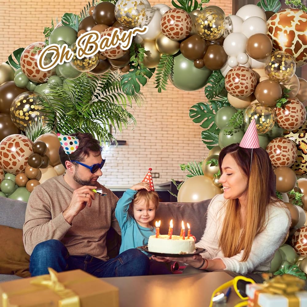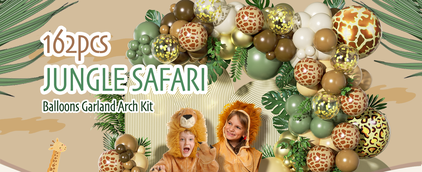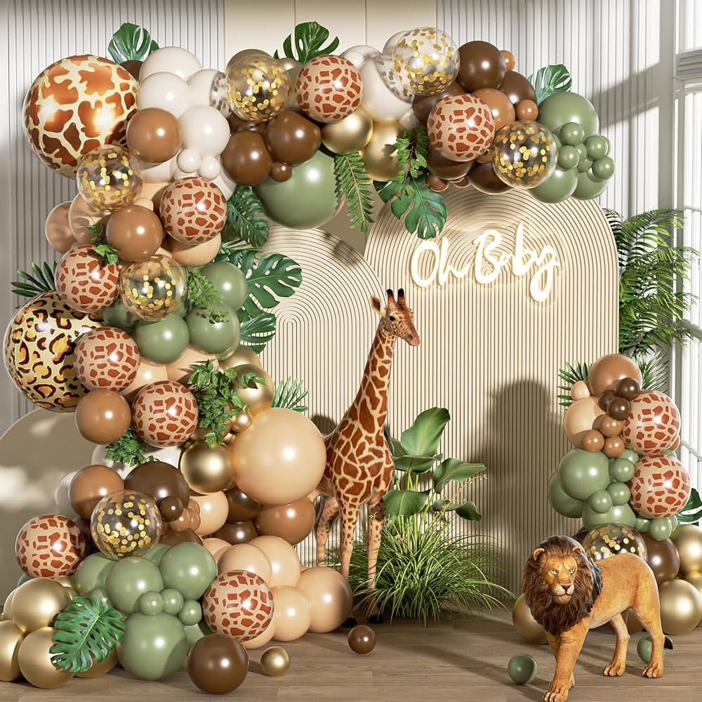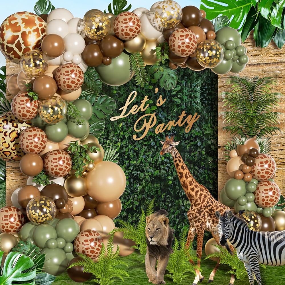 FOTIOMRG 162pcs الغابة سفاري بالون قوس مجموعة إكليل، حكيم الأخضر القهوة براون الحيوان طباعة بالونات أوراق النخيل لاستحمام الطفل الغابات الأولاد اثنين البرية زينة حفلة عيد ميلاد