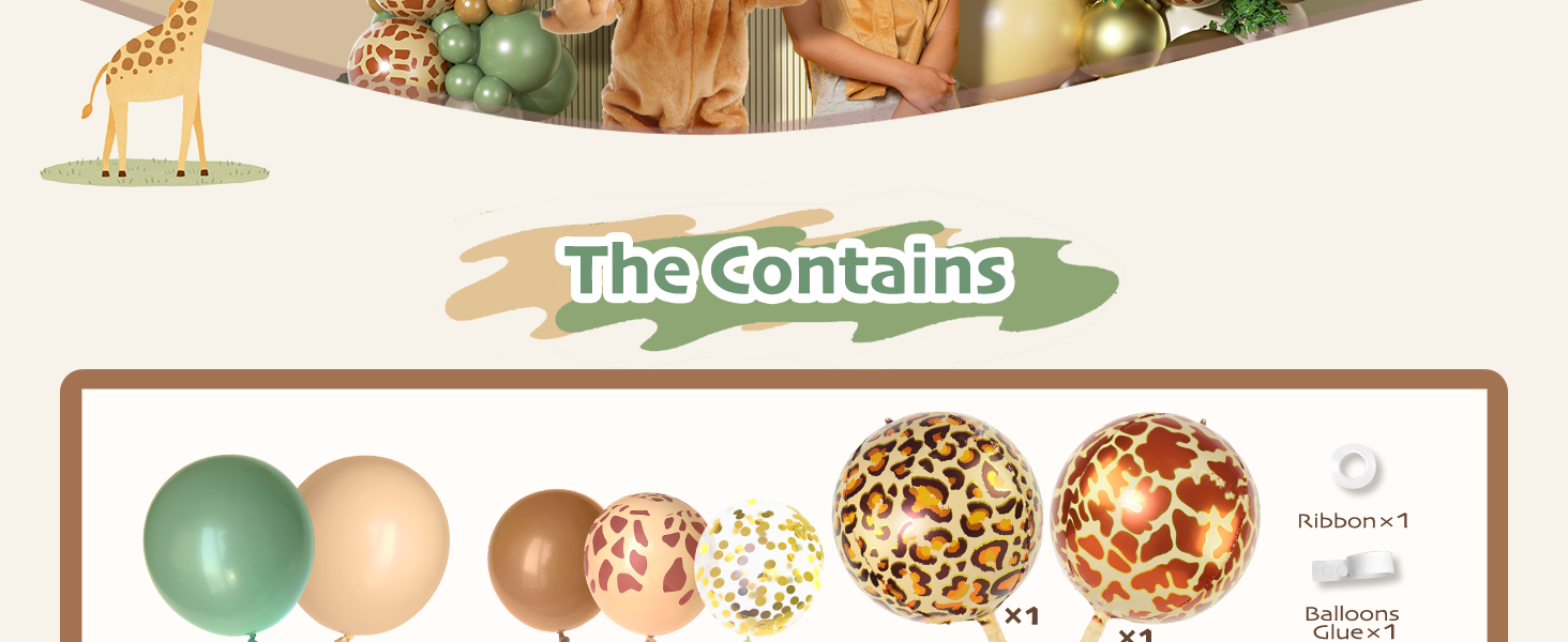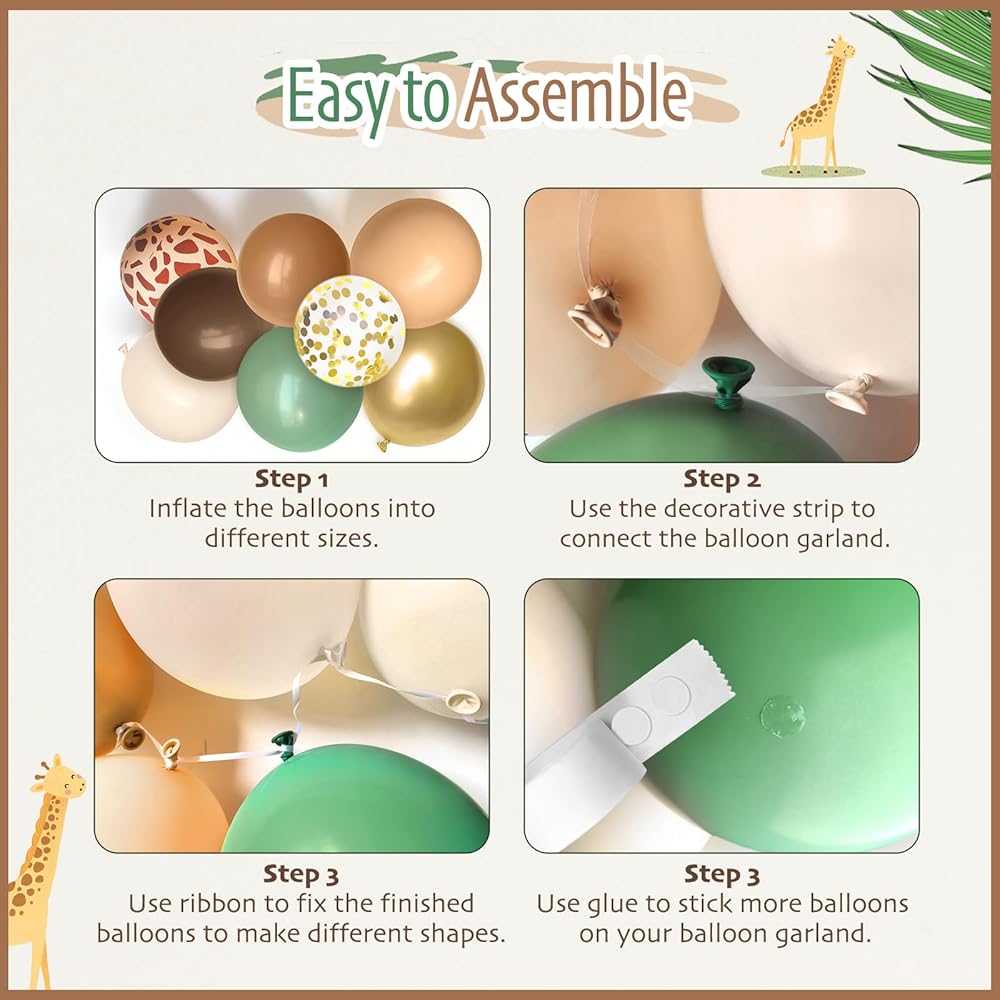 • 【تشمل العبوة】: تشتمل المجموعة على 36 قطعة من البالونات الخضراء المريمية (1 قطعة 18 بوصة، 15 قطعة 10 بوصة، 20 قطعة 5 بوصة)، 31 قطعة بالونات عارية (1 قطعة 18 بوصة، 10 قطعة 10 بوصة، 20 قطعة 5 بوصة)، 25 قطعة من بالونات الكاكاو (10 قطعة 12 بوصة، 15 قطعة 5 بوصة)، بني القهوة بالونات (10 قطع 10 بوصة، 15 قطعة 5 بوصة)، 20 قطعة بالونات ذهبية (5 قطع قصاصات 12 بوصة، 5 قطع 10 بوصة، 10 قطعة 5 بوصة)، 5 قطع بالونات بيضاء رملية 10 بوصة، 1 قطعة 22 بوصة 4D بالون فويل الزرافة، 1 قطعة 22 بوصة 4D بالونات طباعة الفهد، 5 قطع أوراق النخيل، نقطة صمغ ، شرائط، شريط زخرفي