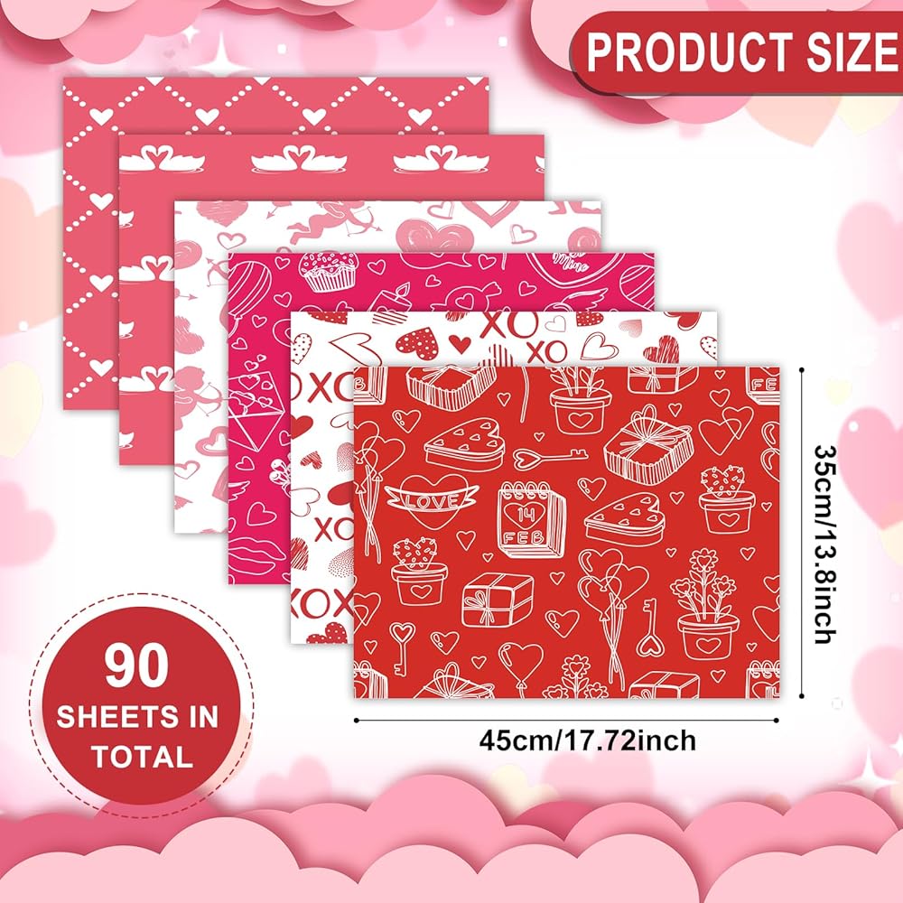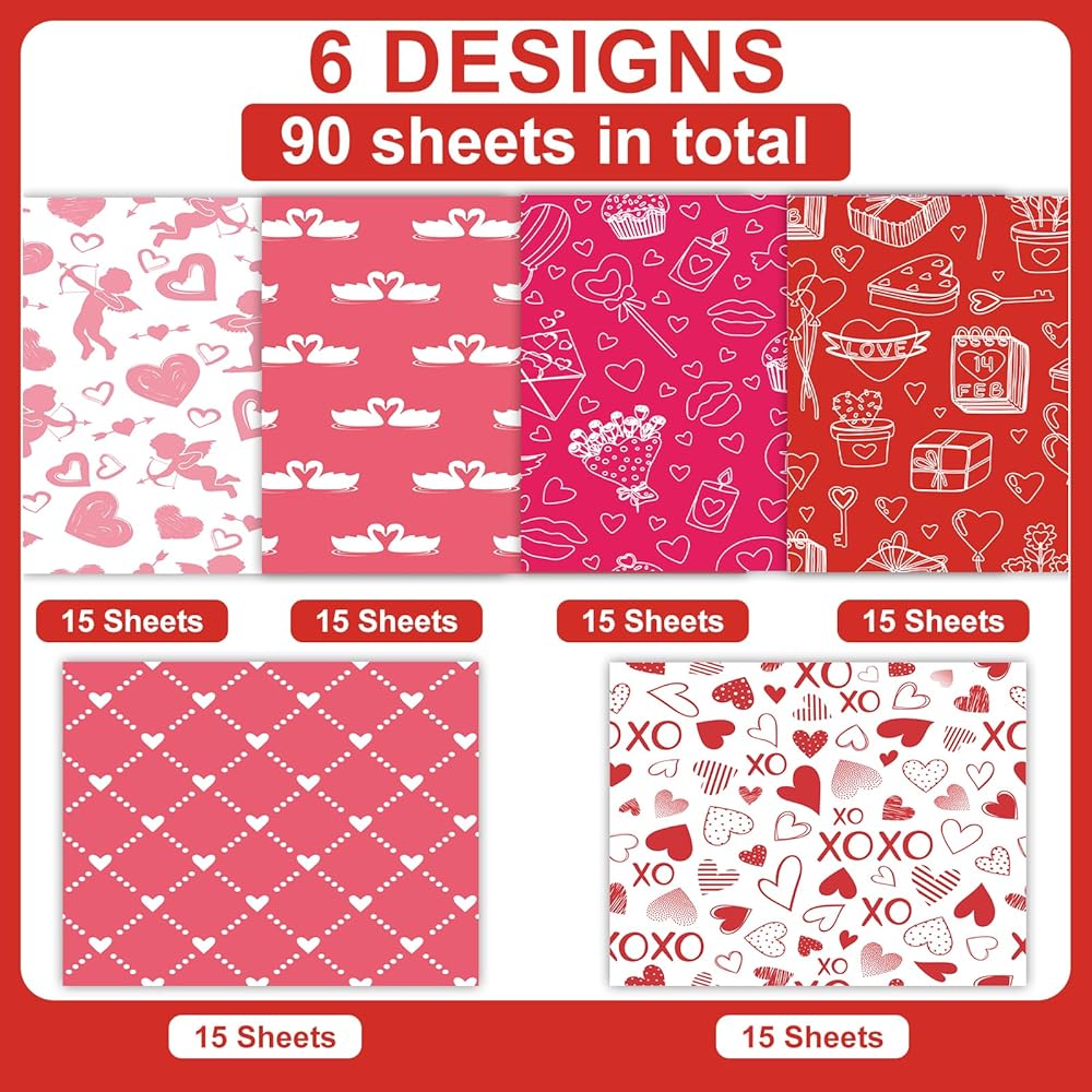 • Package contents: you will receive 90 sheets of Valentine's Day gift wrapping paper in 6 designs and 15 sheets per style. Sufficient quantity to feed your decorative needs.