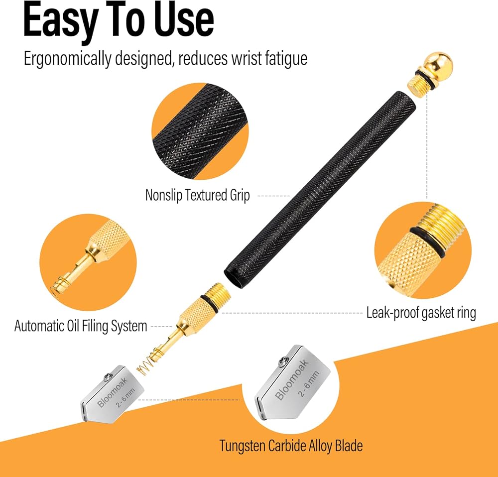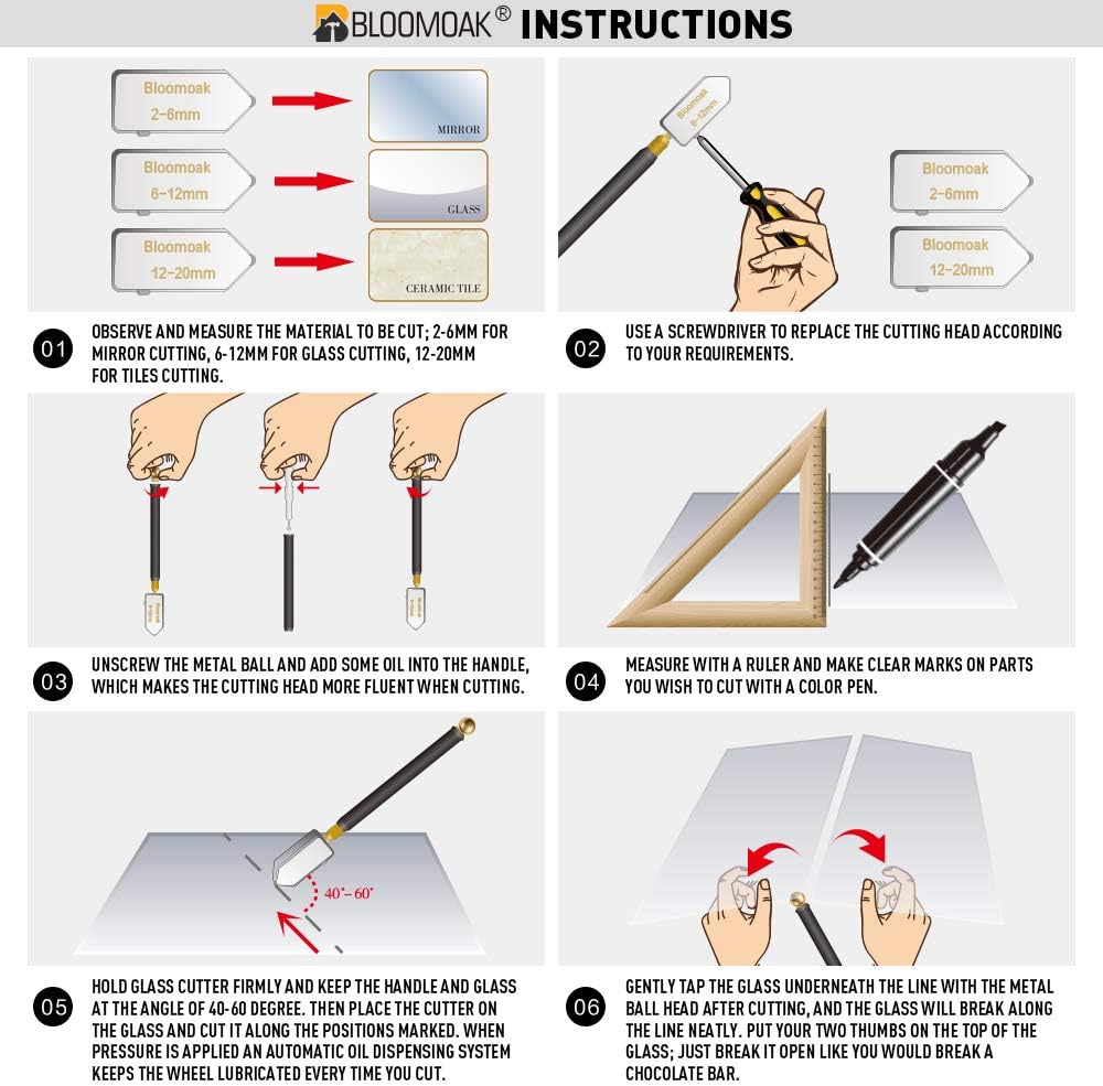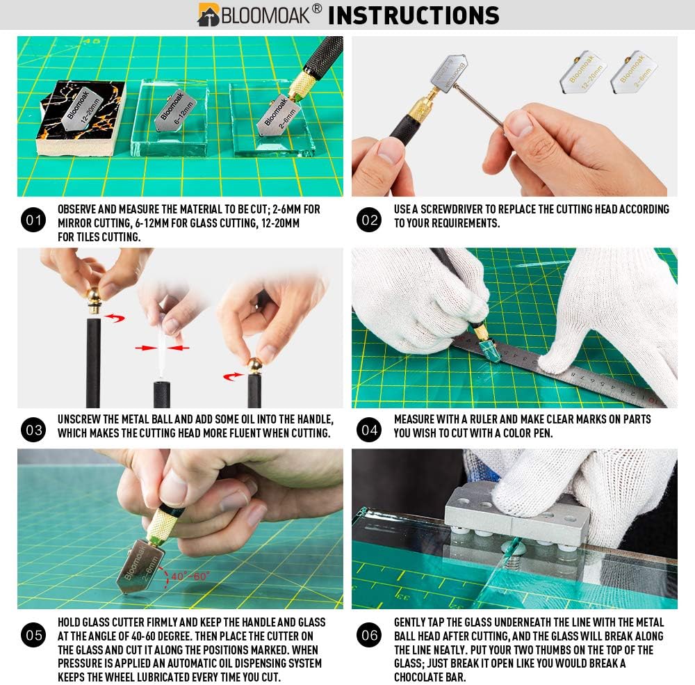 مواد متينة فائقة: مصنوعة من الفولاذ الممتاز وشفرات قطع من كربيد التنجستين المتينة، مما يسمح بالقطع 50,000 مرة وتتفوق على الآخرين حتى 30 مرة! يمكن استخدام قاطع الزجاج من بلوموماك لقطع الزجاج والفسيفساء والزجاج الملون. ضروري للاستخدام في المنزل