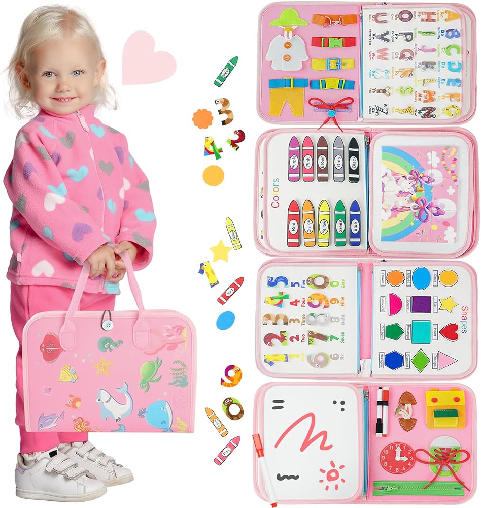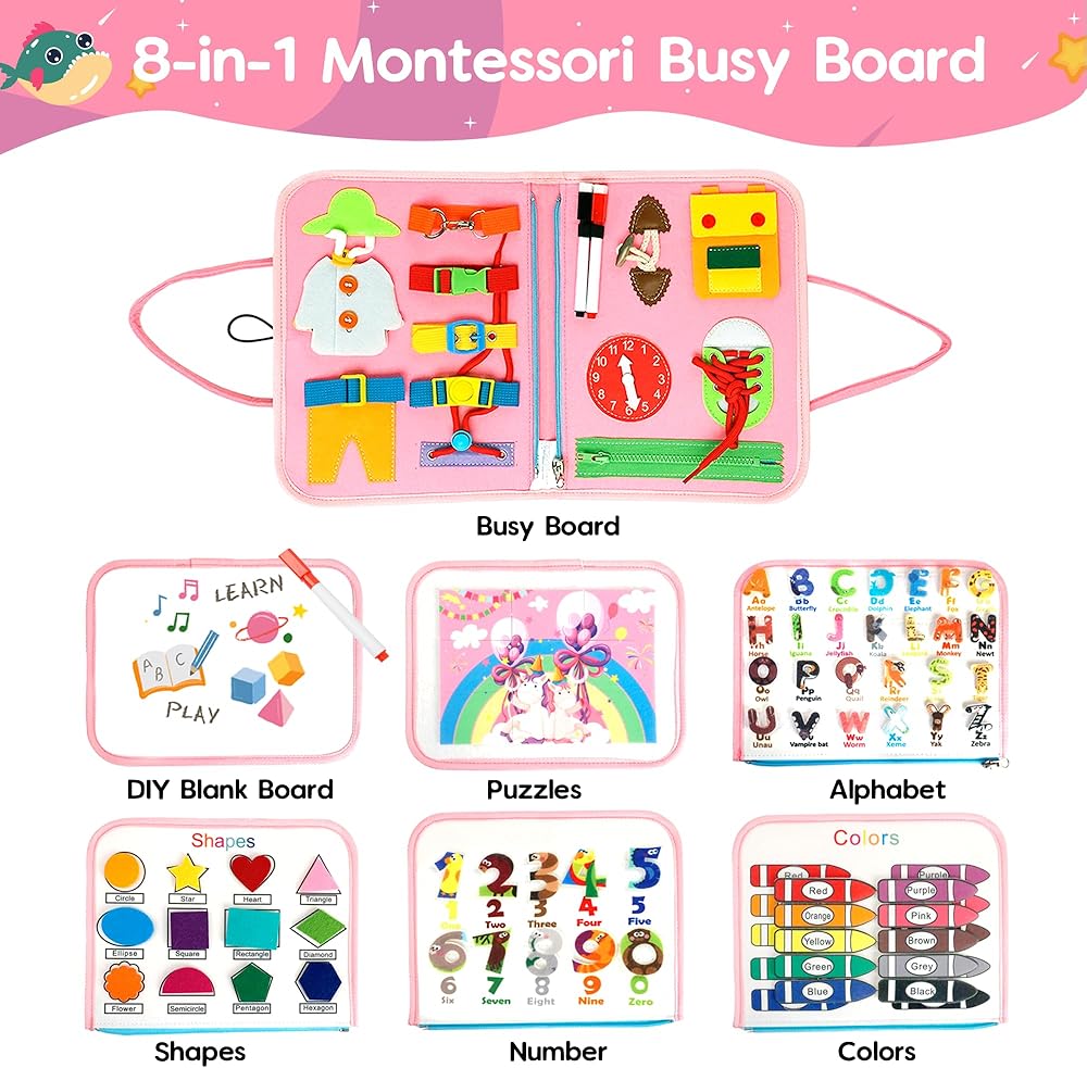 لوحة مشغولة 8 في 1 تبقي الأطفال مشغولين - تحتوي على أرقام وألوان وأشكال وحروف أبجدية وألغاز ولوحة فارغة يمكنك صنعها بنفسك ولوحين لتعلم المهارات الحياتية. ألعاب ما قبل المدرسة لوحة مشغولة لعمر سنة واحدة، لوحة مشغولة للأطفال الصغار 2-4، ألعاب حسية للأطفال الصغار 1-3، ألعاب مونتيسوري لعمر سنة واحدة، ألعاب سفر للأطفال الصغار 1-3، كتاب مشغول للأطفال الصغار 1-3.