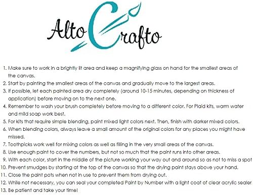 ضمان الرضا بنسبة 100% تشمل العبوة 20 × 16 بوصة طلاء مطبوع مسبقًا حسب الرقم القماشي، 3 فرش احترافية بأحجام مختلفة، طلاء ملون أكريليك عالي الجودة، تعليمات كاملة. إذا كنت بحاجة إلى إرشادات حول تسطيح اللوحة القماشية أو اختيار مقاس الإطار المناسب، فيرجى الاتصال بنا، وسوف نقوم بمعالجة أي سؤال أو قلق في غضون 24 ساعة.