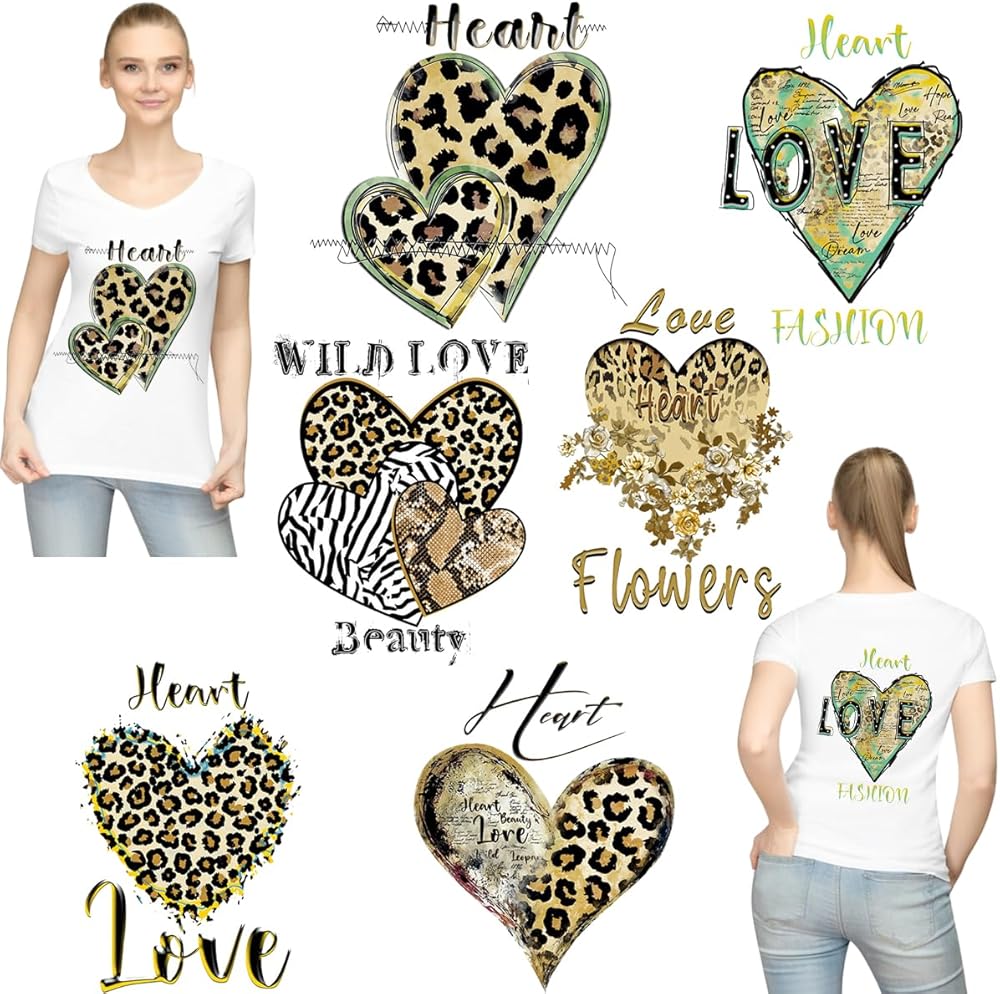 6 Sheets Heart Iron On Patch Leopard Iron On Transfer Decal for Girls Women Heat Transfer Vinyl HTV Sticker for Clothes Sweatshirt T-Shirt Jeans Coat Jacket Handbag Backpack Decoration DIY Design Gift