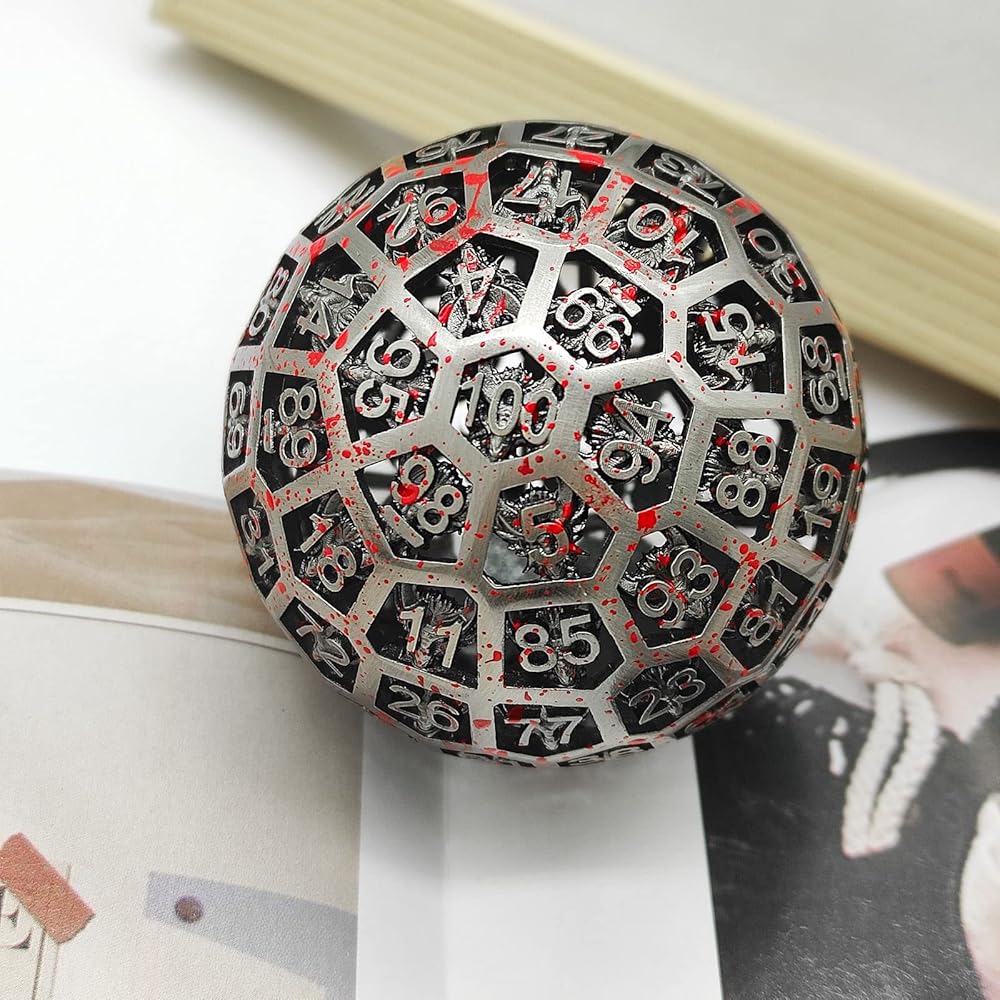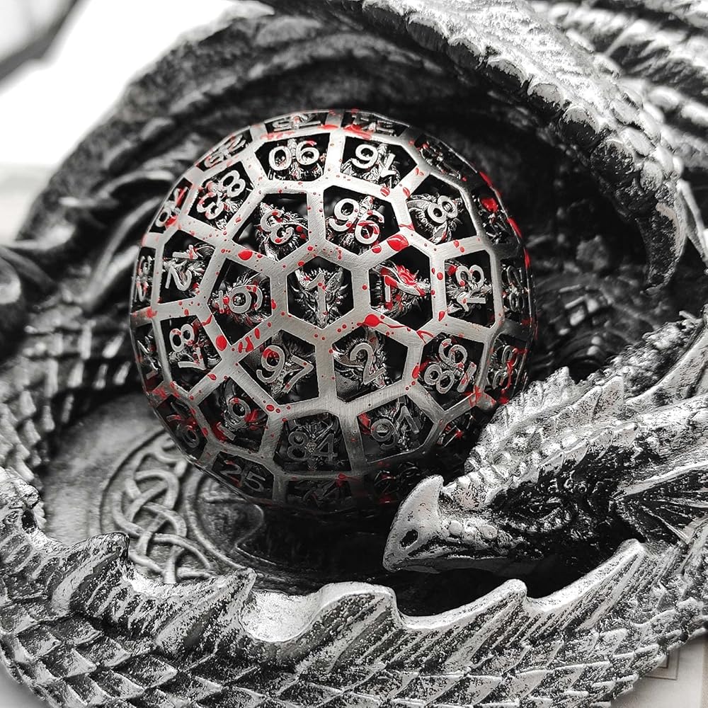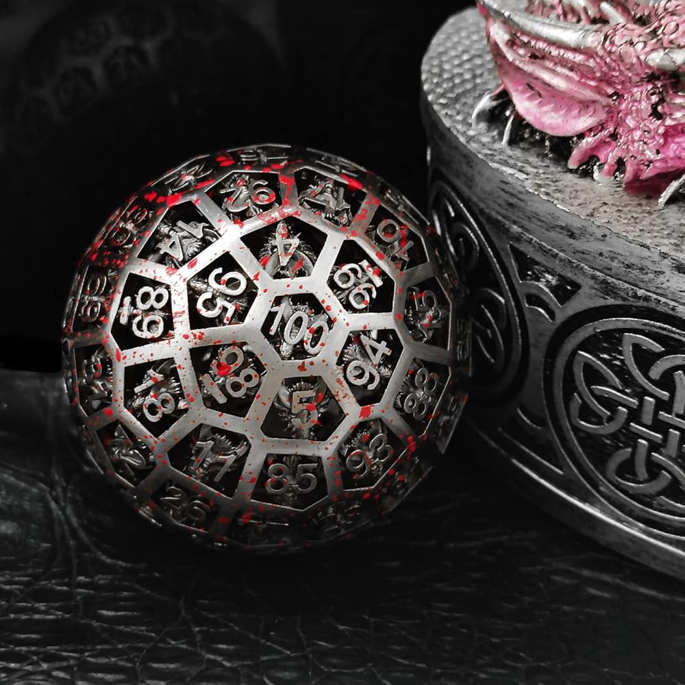 This is a D100polyhedral metal hollow dice with numbers ranging from 1 to 100. The dice has a unique dragon pattern, beautiful appearance, collection and gift to relatives and friends