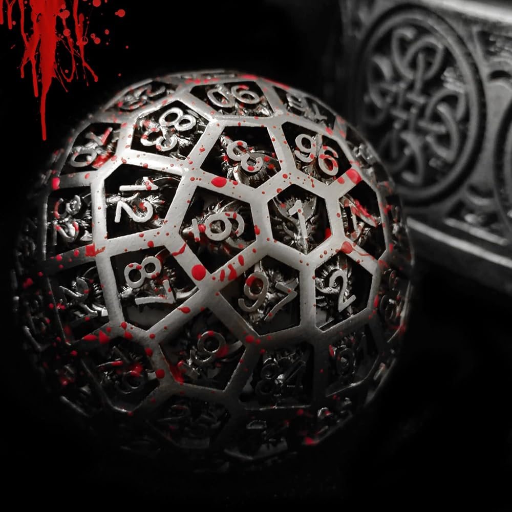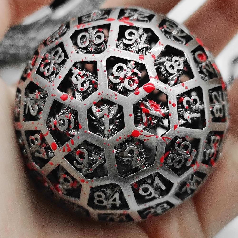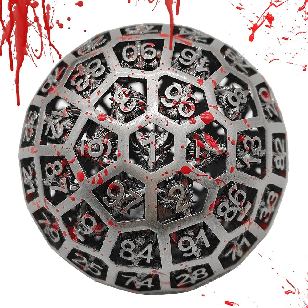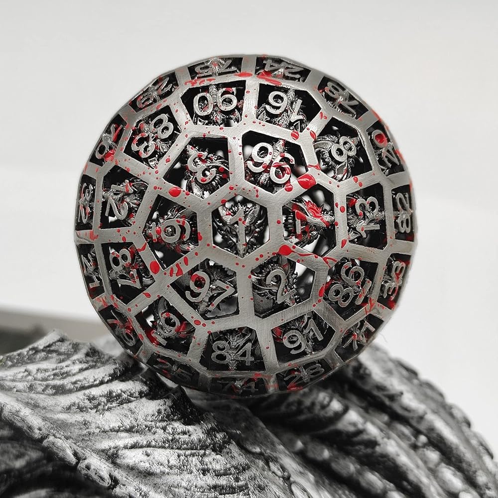 This is a D100polyhedral metal hollow dice with numbers ranging from 1 to 100. The dice has a unique dragon pattern, beautiful appearance, collection and gift to relatives and friends