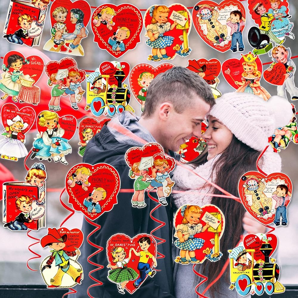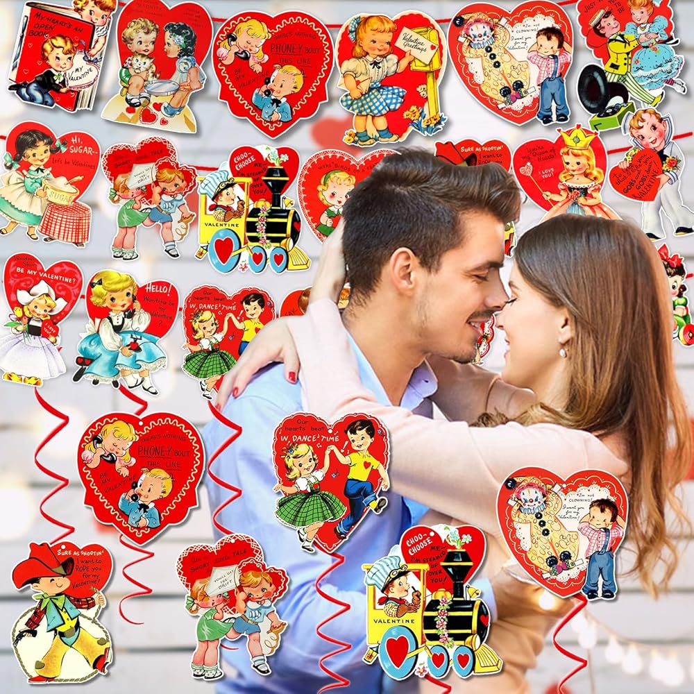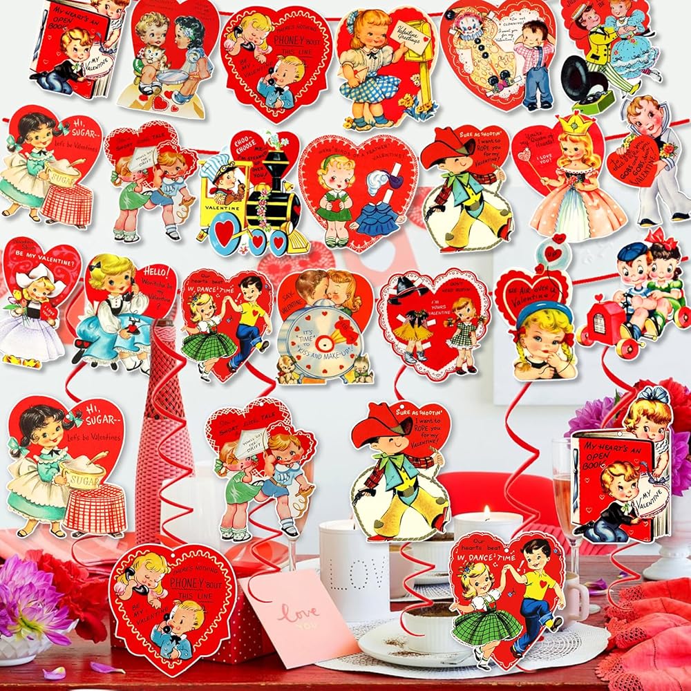 مجموعة ديكورات عيد الحب العتيقة من xituodai تتضمن 3 قطع لافتة عيد الحب مع 20 نمطًا من بطاقات التعليق و9 قطع دوامة معلقة، لوازم حفلات عيد الحب التقليدية