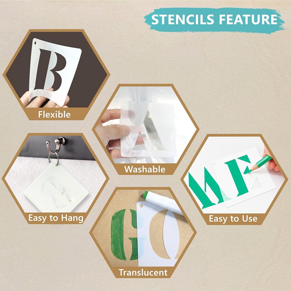 سهلة الاستخدام والتنظيف: خطوط هذه القوالب جميلة واحترافية، مما يجعل الخط ممتعًا وسهل الاستخدام وسهل على الأطفال تعلمه وتتبعه. فقط ضعها بشكل مسطح وثبتها، ثم قم بالطلاء باستخدام قلم/فرشاة أو أداة رش. كما أنها قابلة لإعادة الاستخدام وسهلة التنظيف بالماء والصابون، حتى بعد جفاف الطلاء. مثالي للاستخدام اليومي.