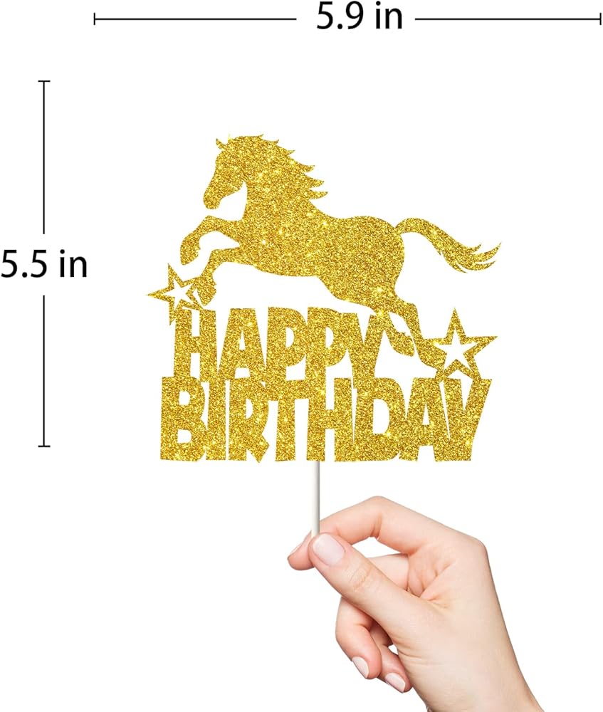 امبيشي زينة كعكة عيد ميلاد سعيد على شكل حصان ذهبي لامع، ديكور حفلات اعياد الميلاد بطابع الفروسية / زينة كعكة عيد ميلاد الحصان، للاولاد او البنات، حفلة 2 و3 و4 و5، لوازم حفلات اعياد الميلاد