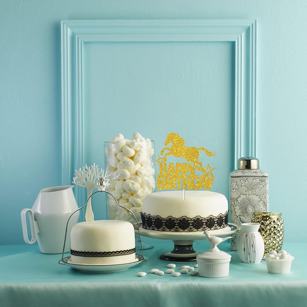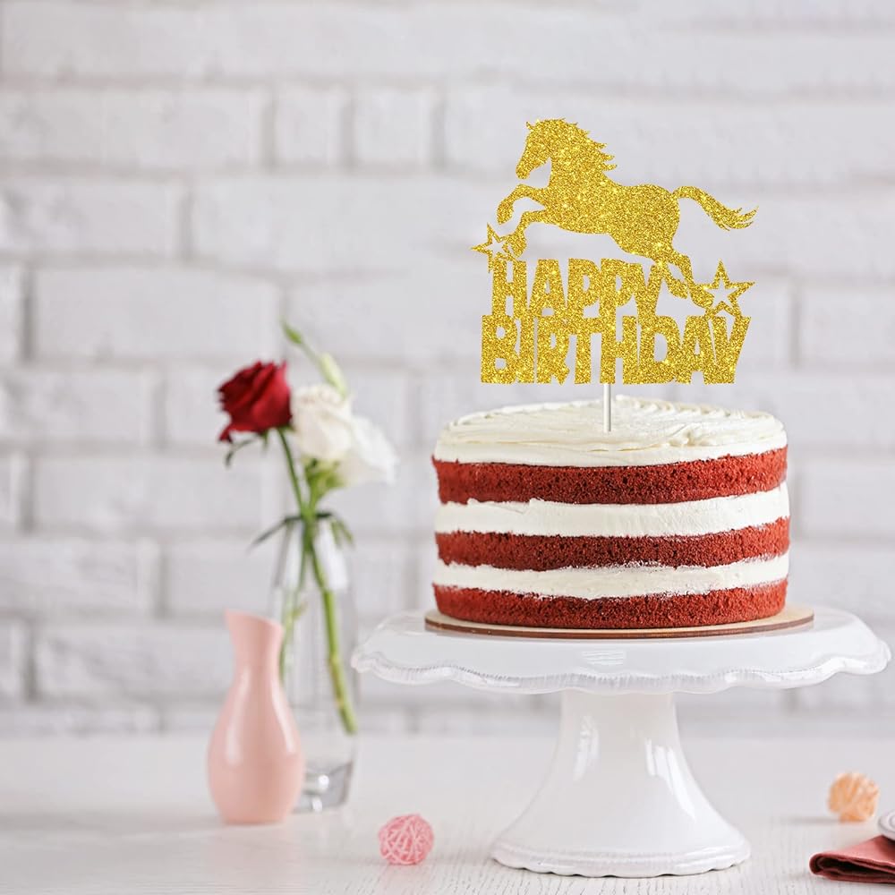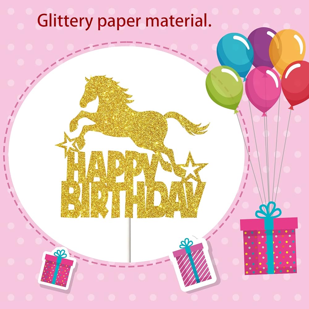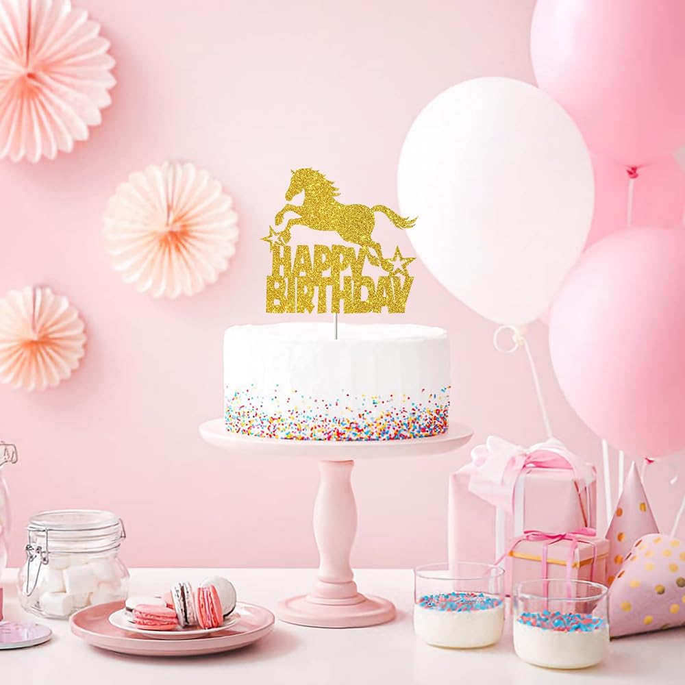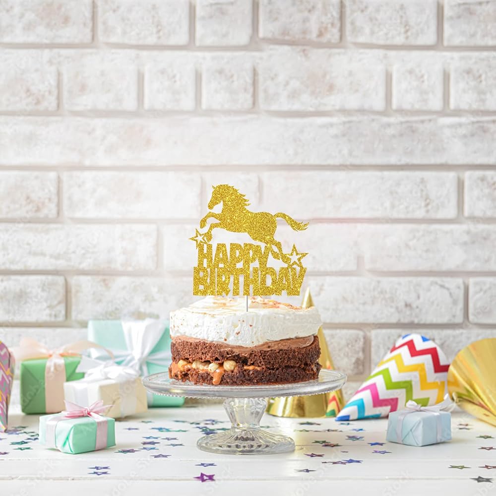 زينة كعكة عيد ميلاد سعيد على شكل حصان ذهبي لامع للأطفال الأولاد والبنات والرجال والنساء مستلزمات حفلات أعياد الميلاد