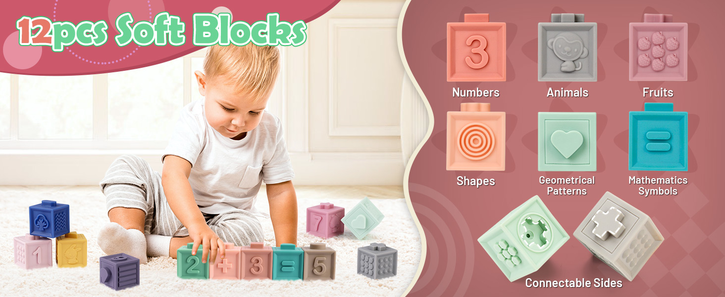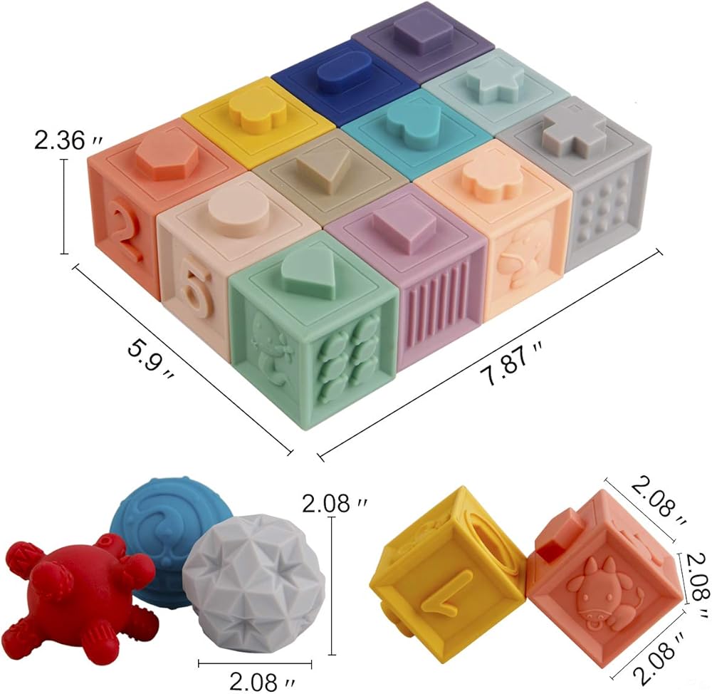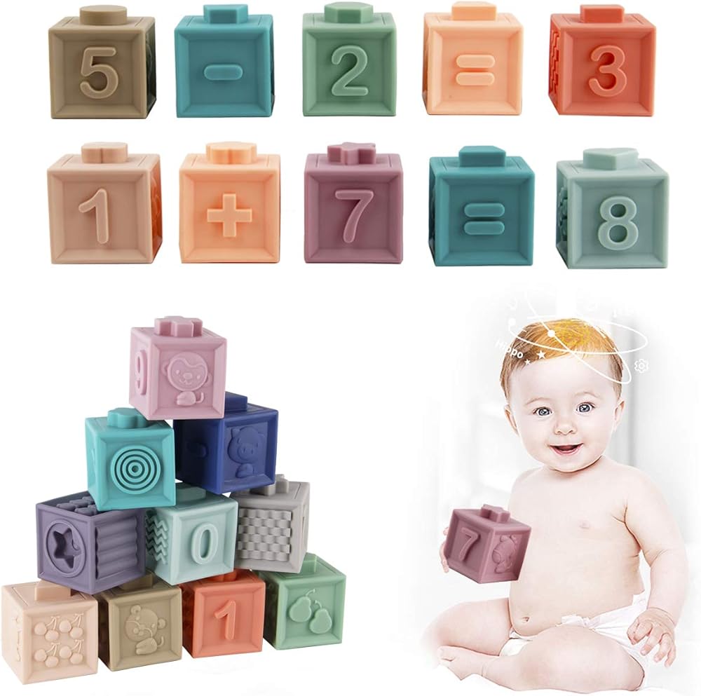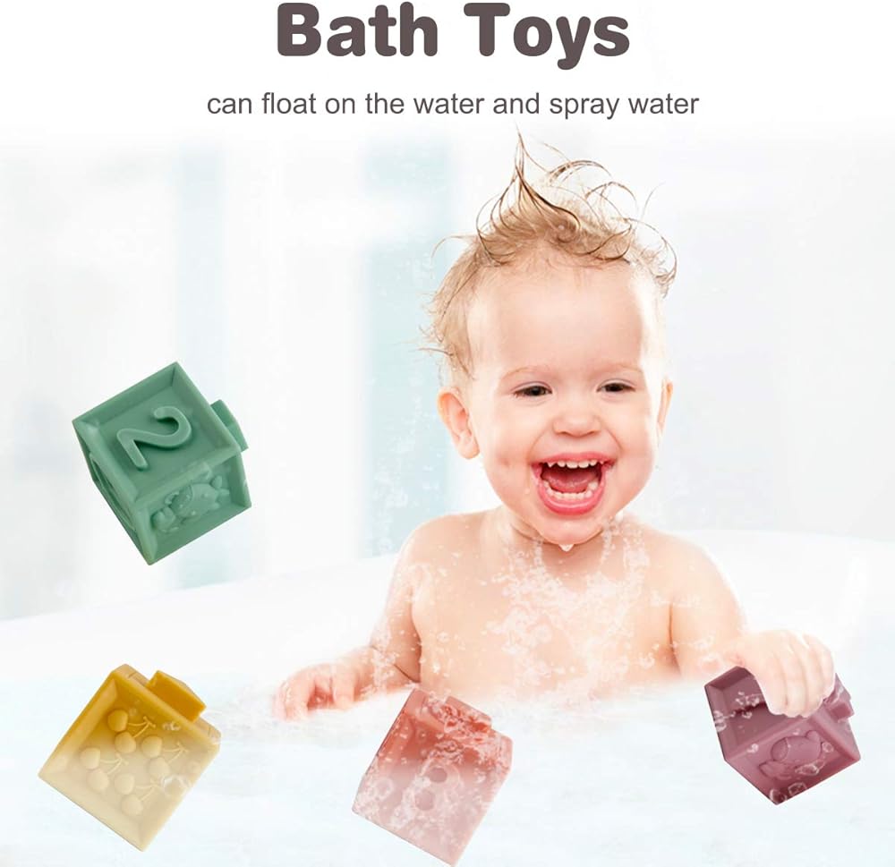 مكعبات قابلة للمضغ وألعاب الحمام - مكعبات ألعاب التراص هذه ناعمة ومتينة، وهي قابلة للمضغ والتكديس والعصر، ومناسبة لأي نشاط. إنها أفضل ألعاب التسنين للأطفال من عمر 6 إلى 12 شهرًا. يمكن أيضًا أن تكون لعبة استحمام، ويمكن أن تطفو على الماء وتضغط لرش الماء.