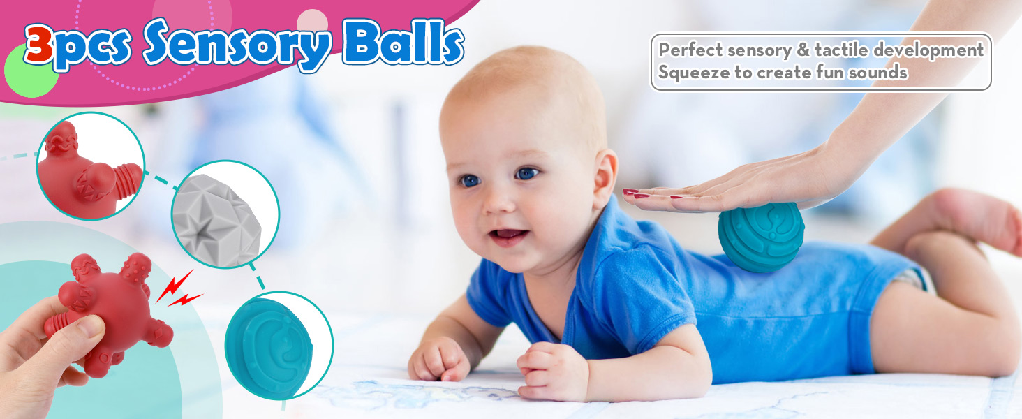 كرة حسية مزخرفة - سيستمتع كل طفل بألعاب حسية ناعمة من أجل المتعة، كما أن الكرات الحسية العلاجية فعالة في تحفيز التدليك. إن دحرجة الكرات ذات النسيج بلطف على ظهر الطفل أو قدميه يزيد من الوعي الحسي.