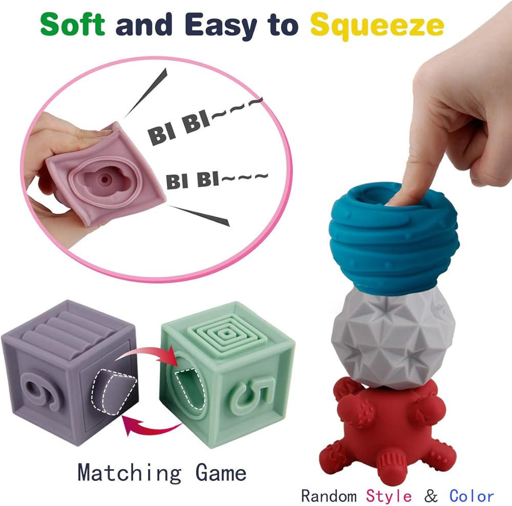 مكعبات ناعمة وصوتية - مكعبات فائقة النعومة وسهلة الضغط لإصدار صوت صرير للأطفال الصغار والرضع للعب. تشجع على الوصول والإمساك، وتساعد على جذب انتباه الطفل وتساعد على النمو السمعي للطفل.