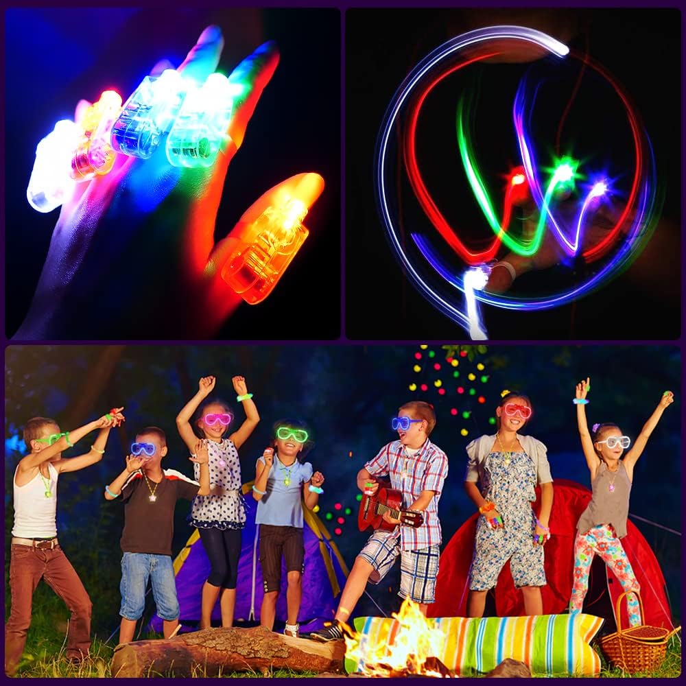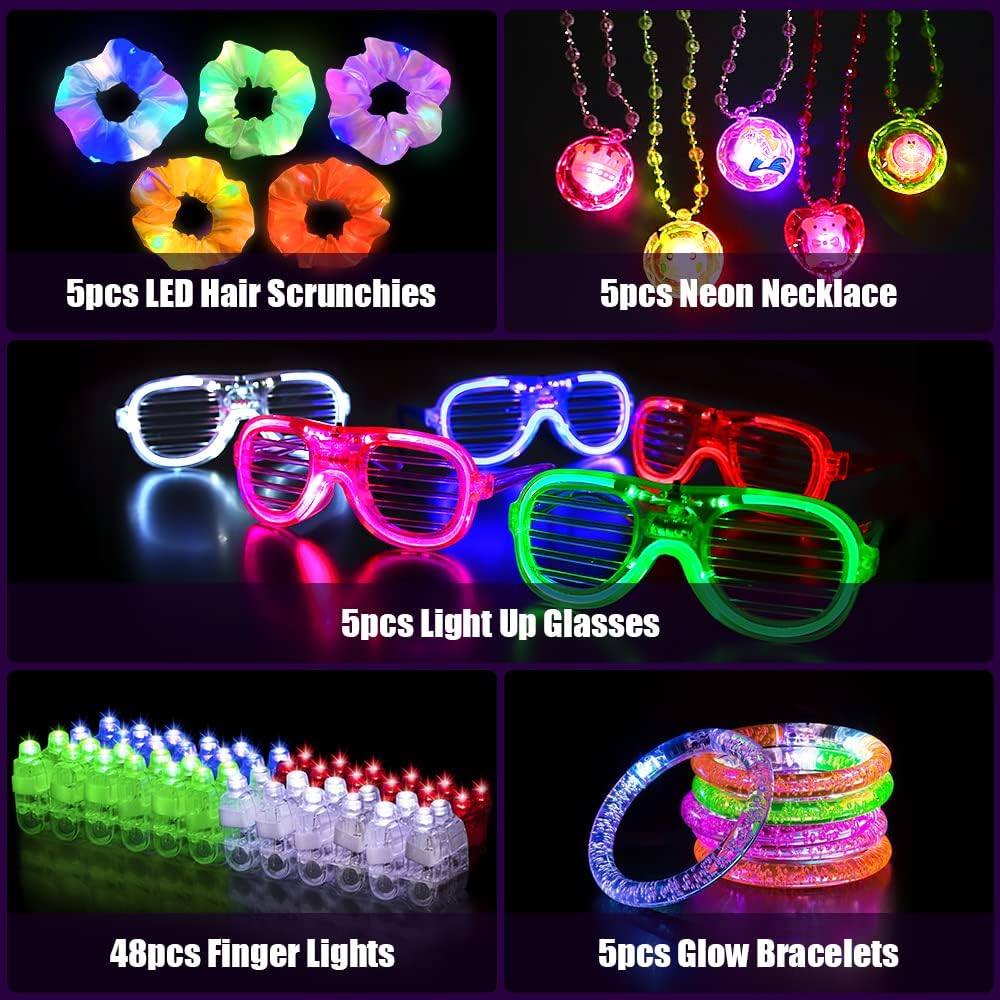 【لوازم وديكورات الحفلات المتوهجة】: 48 قطعة من مصابيح الأصابع، 5 قطع من النظارات المضيئة، 5 قطع من ربطات الشعر LED، 5 قطع من قلادات النيون، 5 قطع من الأساور المتوهجة. كل لعبة تتوهج في الظلام يمكن أن تتألق بألوان زاهية بما يكفي لجذب أنظار أي شخص، وإضاءة جو حفلتك!