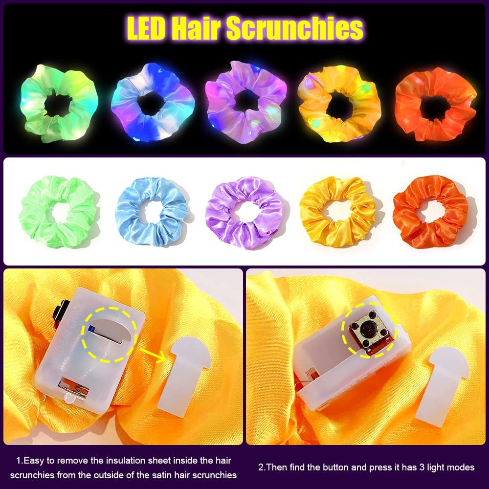 【ربطات شعر LED】: ناعمة ومريحة مع أشرطة مطاطية متينة بداخلها تتمدد وتتمدد. إضاءة LED مدمجة: تجعلك الشخص الأكثر جاذبية بين الناس، خاصة في حفلة النيون. 3 أوضاع إضاءة، من السهل إزالة القطعة البلاستيكية داخل ربطات الشعر من الخارج من ربطات الشعر الساتان، ثم ابحث عن الزر واضغط عليه.