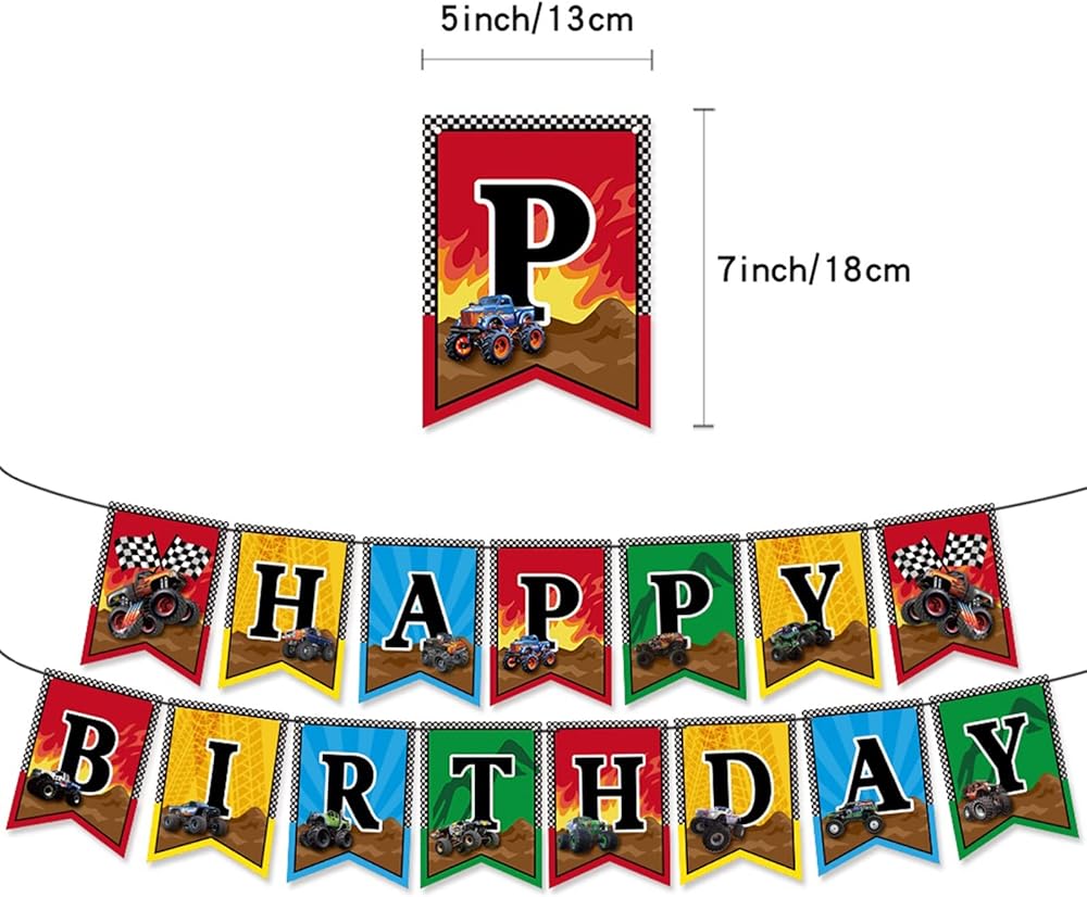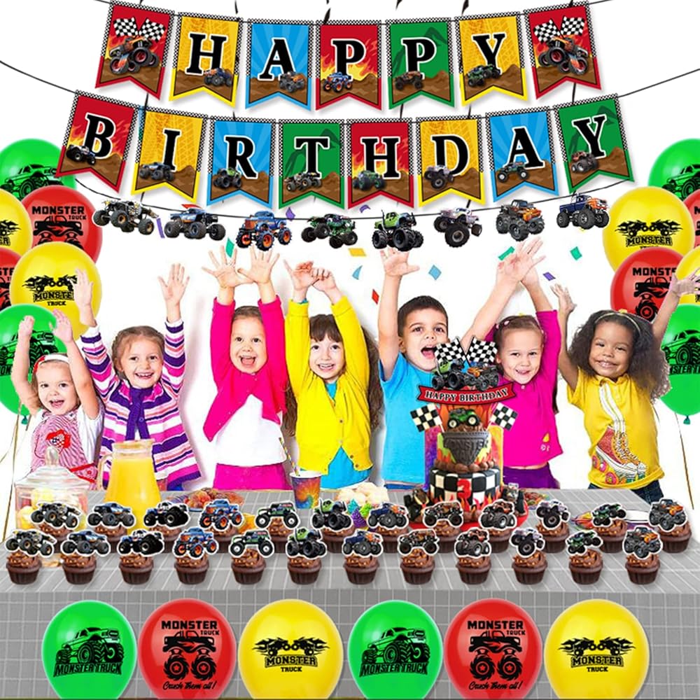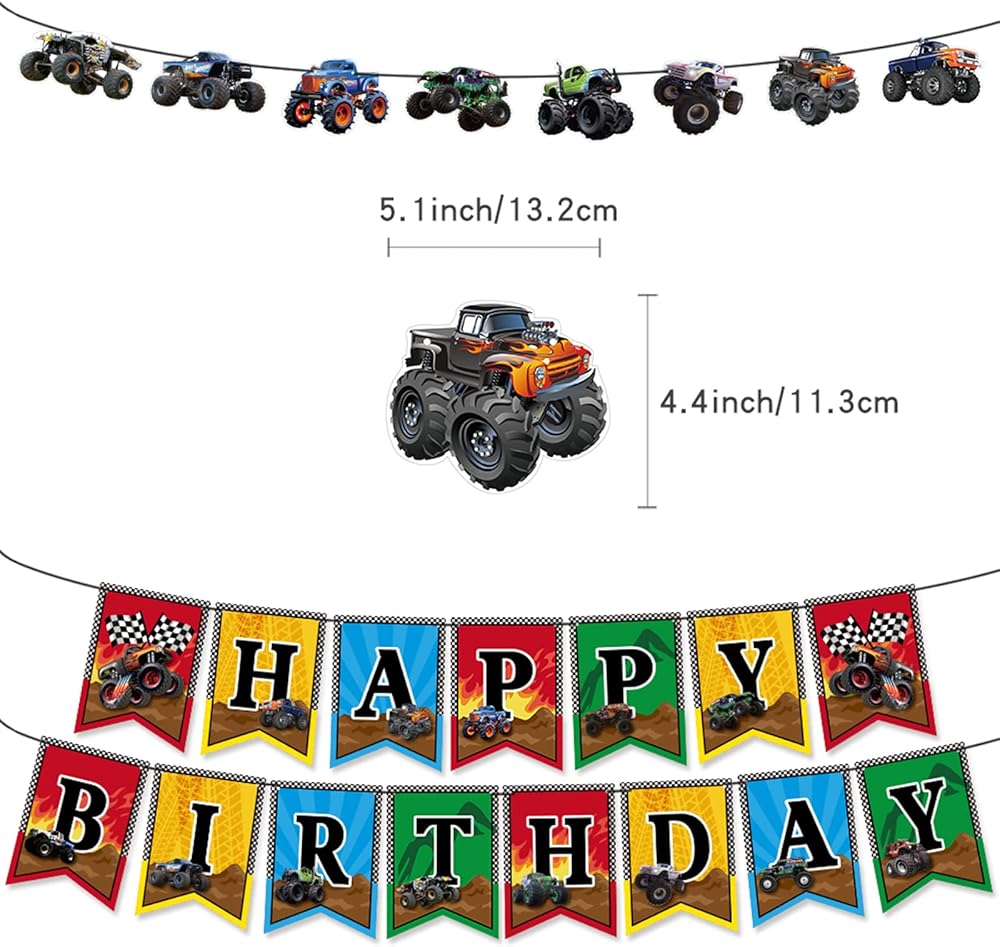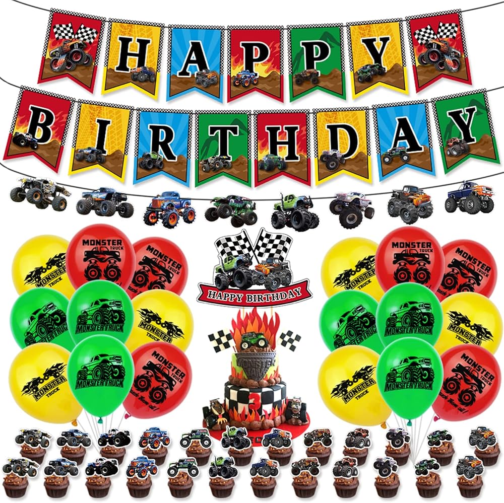 مجموعة تزيين أعياد الميلاد الكاملة: تتضمن لوازم حفلات عيد الميلاد من مونستر تراك مجموعة من لافتة حروف "هابي بيرثداي" تضم شخصيات "مونستر ترين"، ولافتة على شكل شاحنة مونستر و18 بالون بطابع شاحنة مونستر و1 زينة كعكة على شكل شاحنة مونستر و24 قطعة علوية للكب كيك على شكل شاحنة وحش.