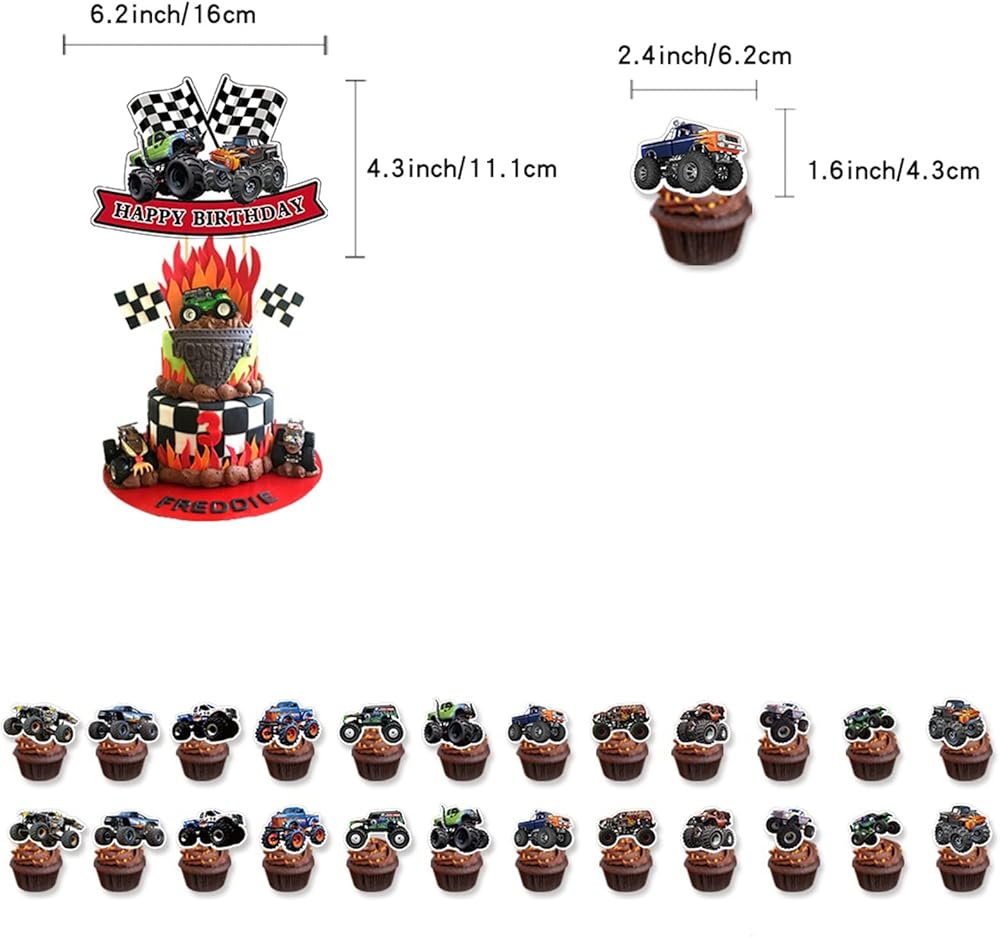 ما ستحصل عليه: لافتة عيد ميلاد سعيد، لافتة واحدة على شكل شاحنة عملاقة، 18 بالون بطابع شاحنة وحش، 1 زينة كعكة على شكل شاحنة وحش، 24 قطعة تزيين الكب كيك على شكل شاحنة وحش.
