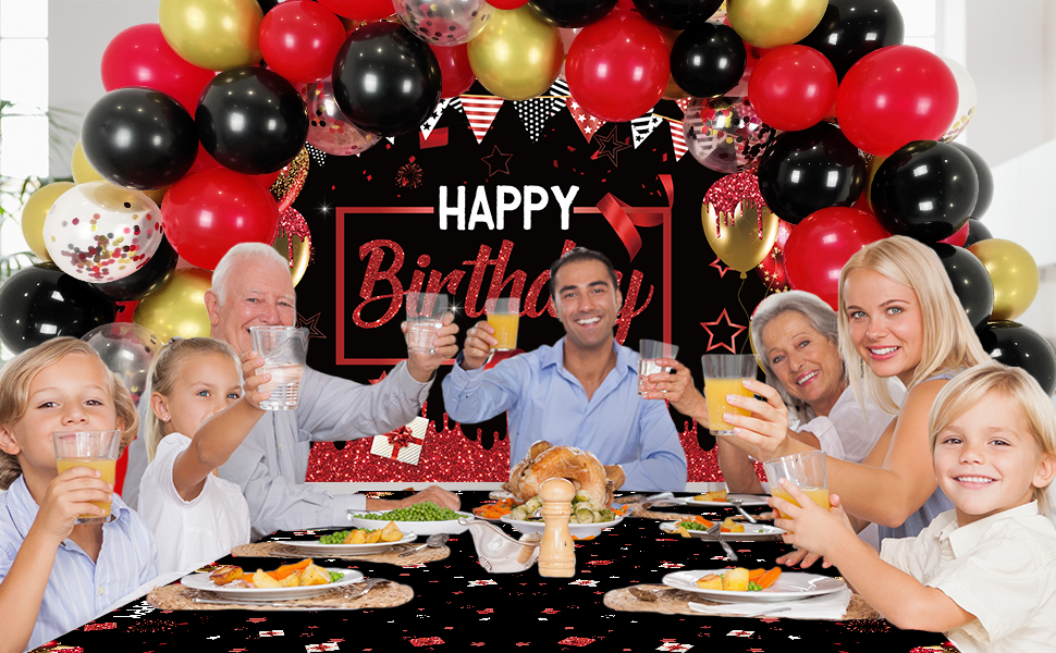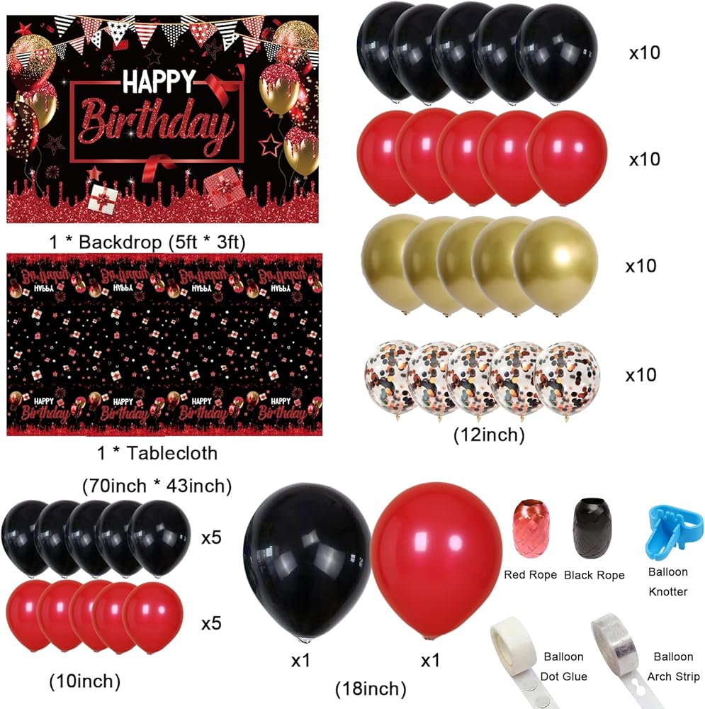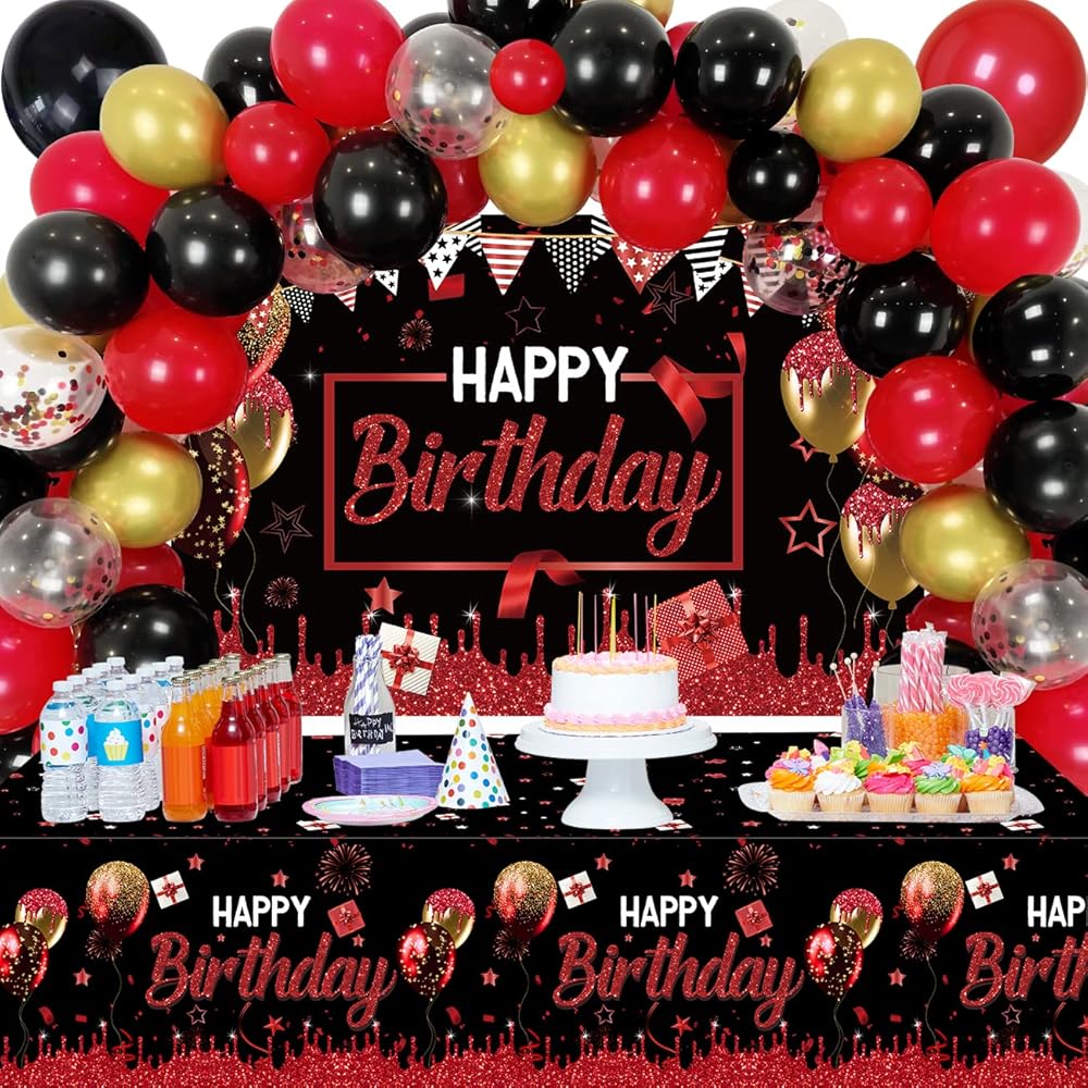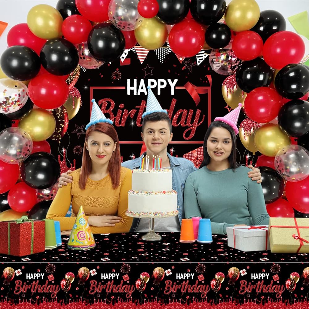 زينة حفلات عيد الميلاد الأحمر والأسود للرجال والنساء - قوس قوس أحمر وأسود وذهبي مع خلفية عيد ميلاد سعيد حمراء وغطاء طاولة لمستلزمات الحفلات بوي جيرل بادي