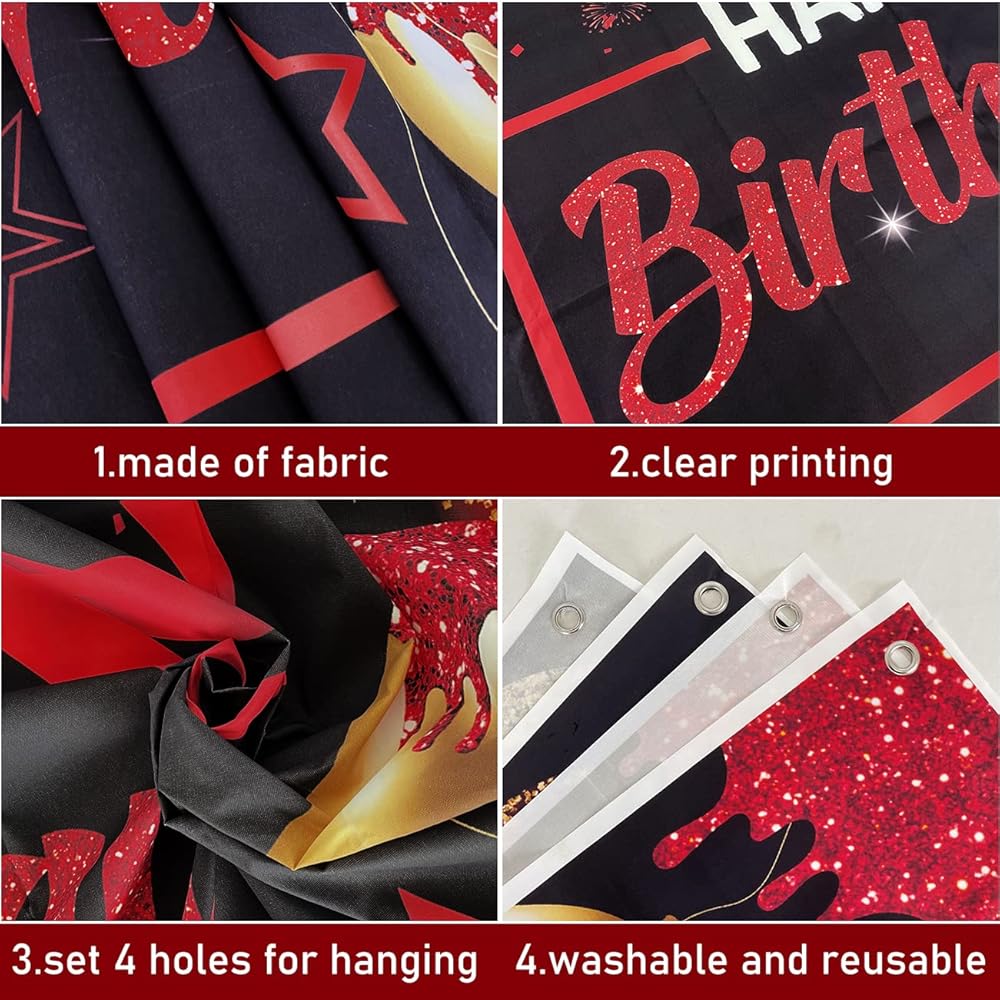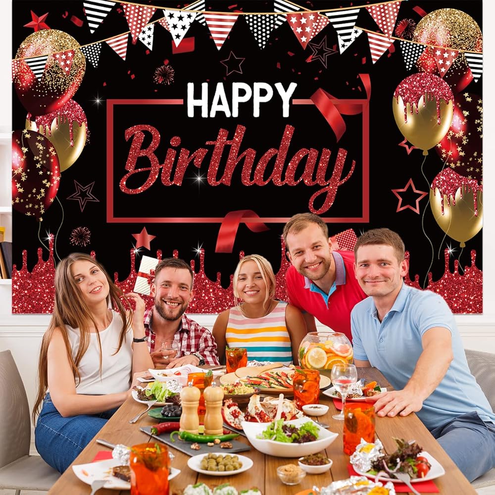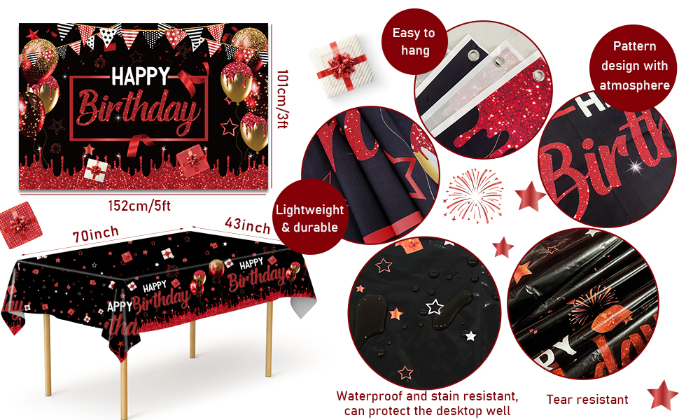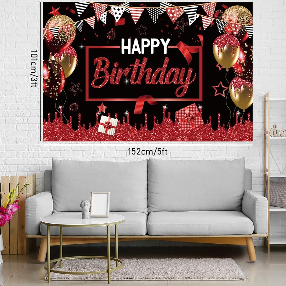 زينة حفلات عيد الميلاد الأحمر والأسود للرجال والنساء - قوس قوس أحمر وأسود وذهبي مع خلفية عيد ميلاد سعيد حمراء وغطاء طاولة لمستلزمات الحفلات بوي جيرل بادي