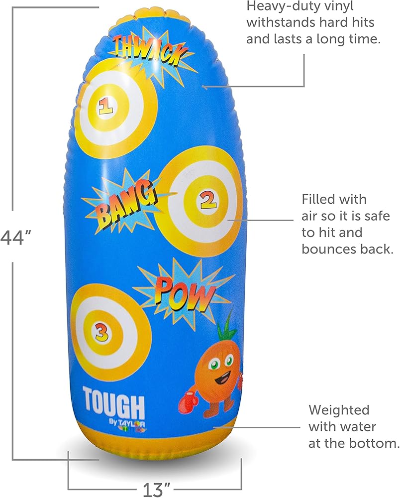 Taylor Toy Punching bag is great for kids of all ages. The bag inflates easily and has a pouch at the bottom to insert water or sand to make it bottom heavy.