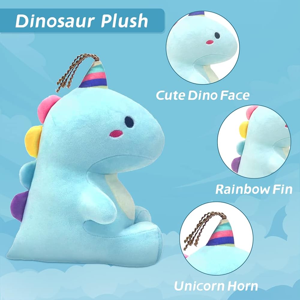 【حيوان محشو بالديناصورات مع قرن وحيد القرن】 قطيفة ديناصور كرتونية لطيفة، مستوحاة من وحيد القرن، مع قرن ملون وشعر فوق الرأس. عيونه المطرزة وخده الأحمر جذابة للغاية. دمى ديناصور رائعة لمحبي الديناصورات والأطفال والفتيات المراهقات والصديقات والأخوات.
