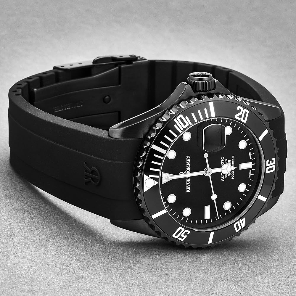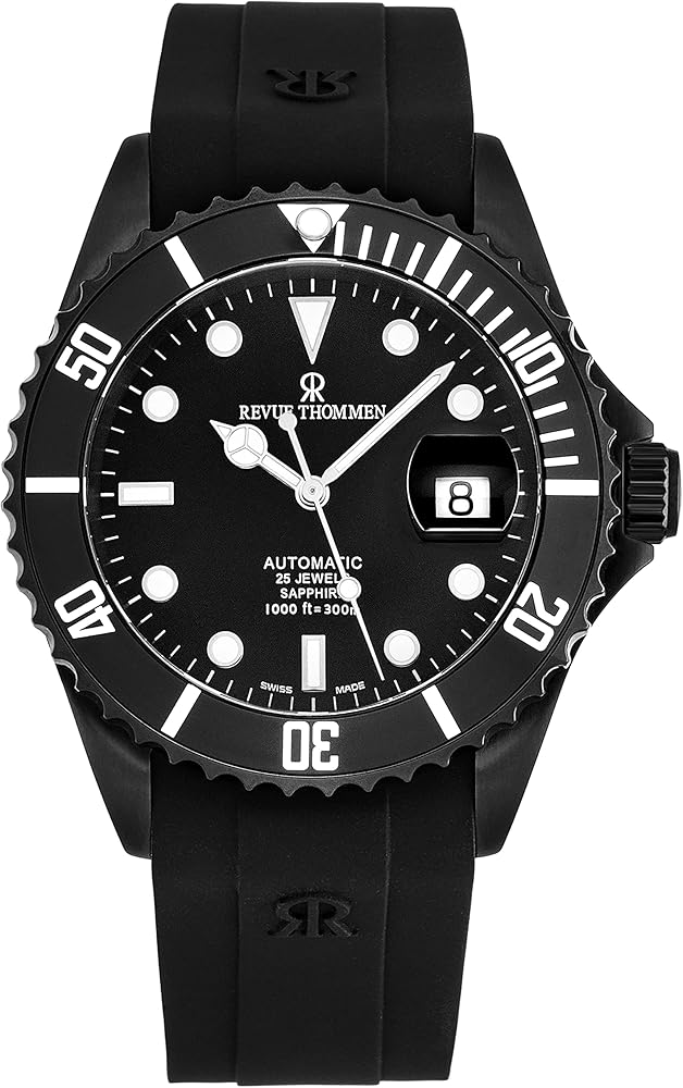 Black dial enhanced by luminous silver-tone hands. Black-plated stainless steel case with a black rubber band. Automatic movement. 300 meters / 1000 feet water resistance. Uni-directional Rotating bezel. Scratch Resistant Sapphire crystal. Solid caseback. Deployment with Push Button Release clasp. Screw Down crown. Case size 42 mm x 12.65 mm. Band 22 mm x 8 incheslong. Revue Thommen 17571.2877 Diver Watch.
