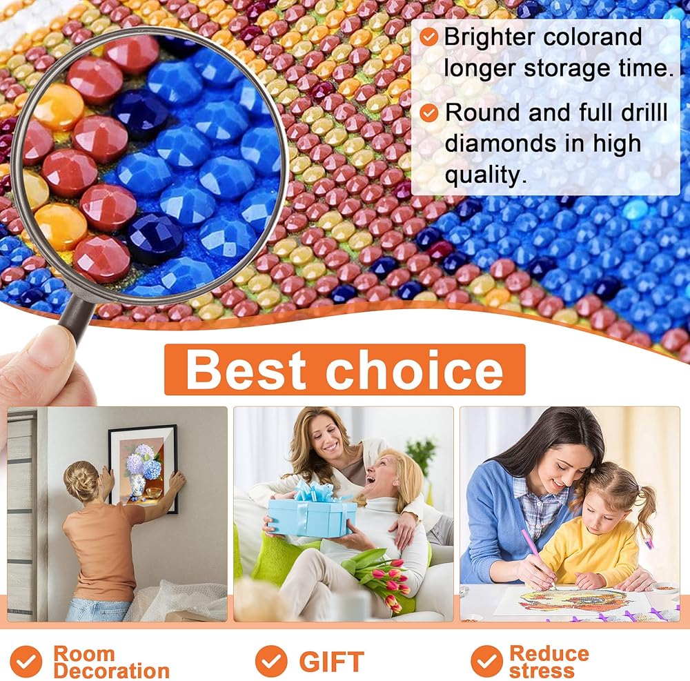 • Add more fun to life-DIY diamond painting can relieve stress, adjust emotions, increase self-confidence and persistently develop patience. Suitable for the elderly/childredults. Diamond art kits are extremely popular decorative kits, diamond painting kits can also be used as a gift for birthdays, Christmas, Thanksgiving, parties, weddings, etc.