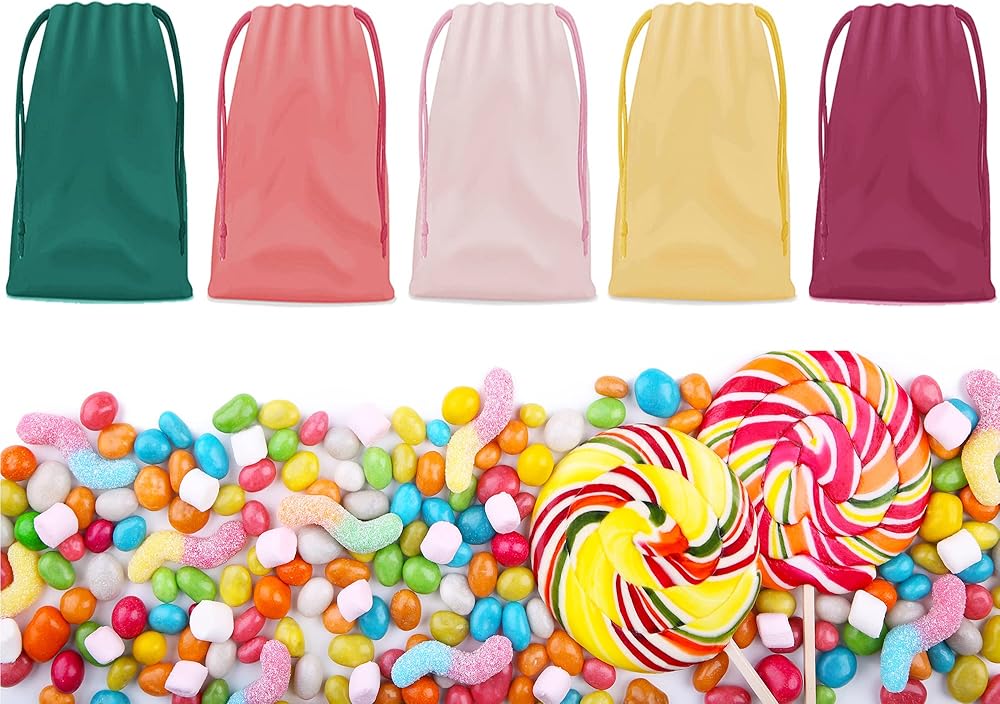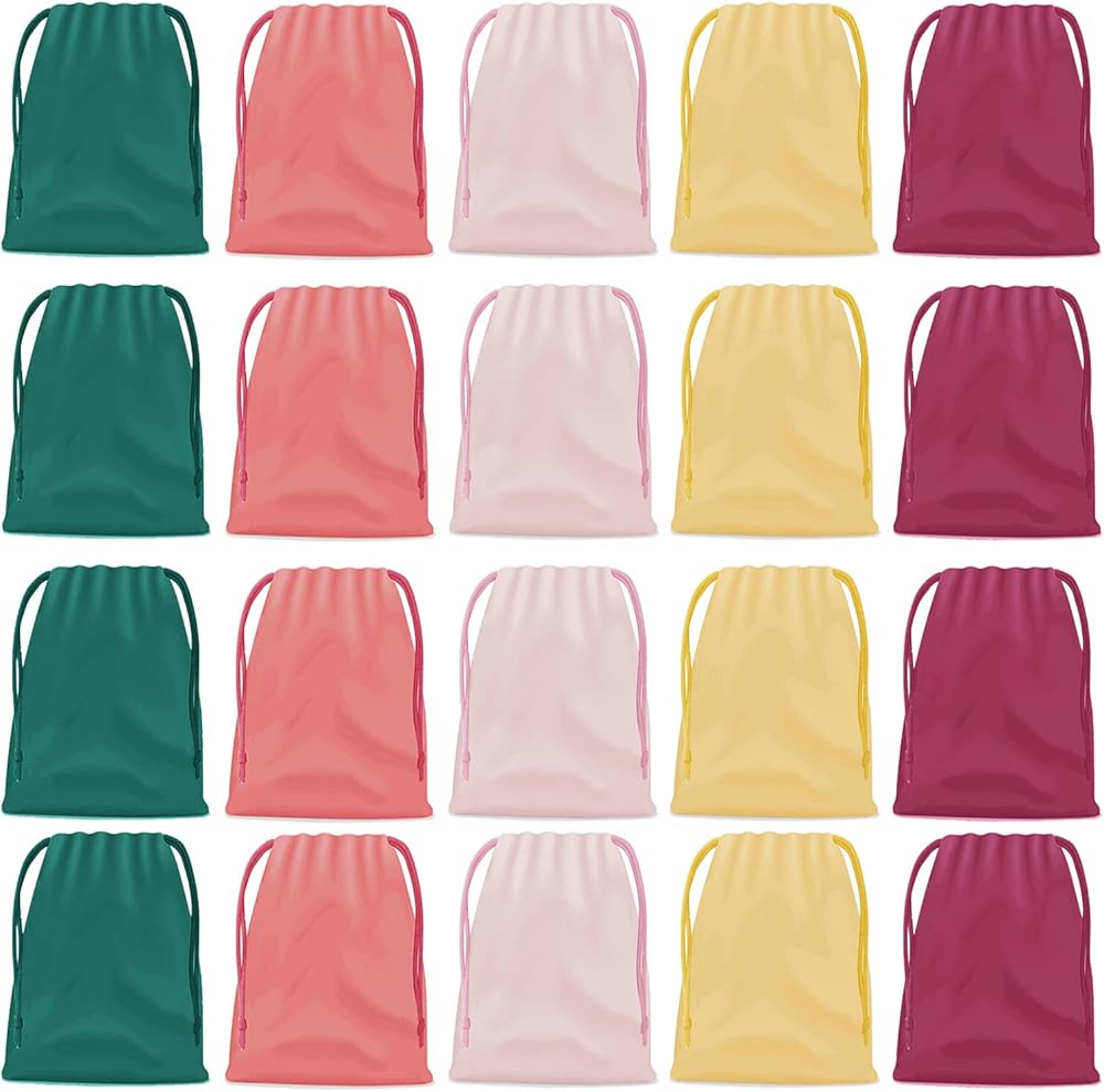 حقيبة هدايا بدون رباط من 25 قطعة من مجوهرات حفلات الزفاف وحقيبة برباط سحب 20.32 سم × 25.4 سم (وصلة سفلية) حقائب بلاستيكية بألوان متنوعة لتغليف هدايا الأطفال في الحفلات.