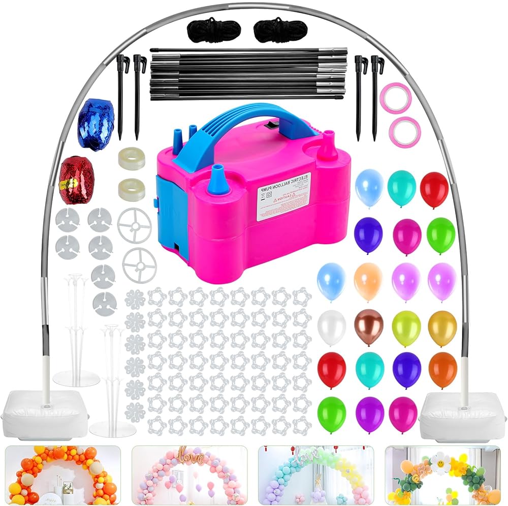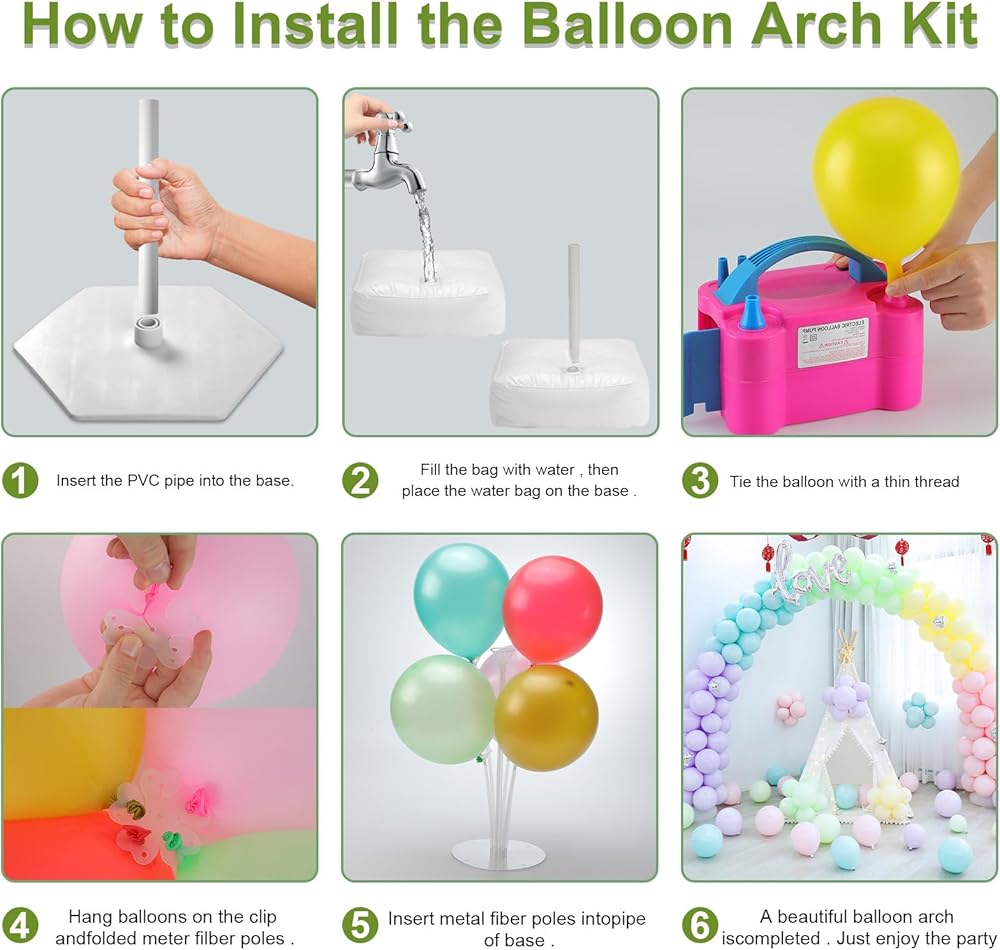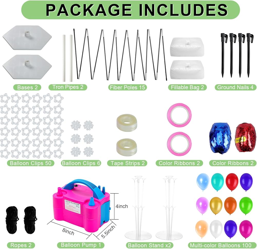 Packing List: This balloon arch kit includes electric pump x1, Water Bag x2, Base x2, Glass Fiber Pole x15, PVC Pipe x2, Balloon Stand x2, Balloon Clip x50, Ground Nail x4, Secure Rope x2, Tape Strip x2, Color Ribbon x4, Flower Clip x6, Balloons x100