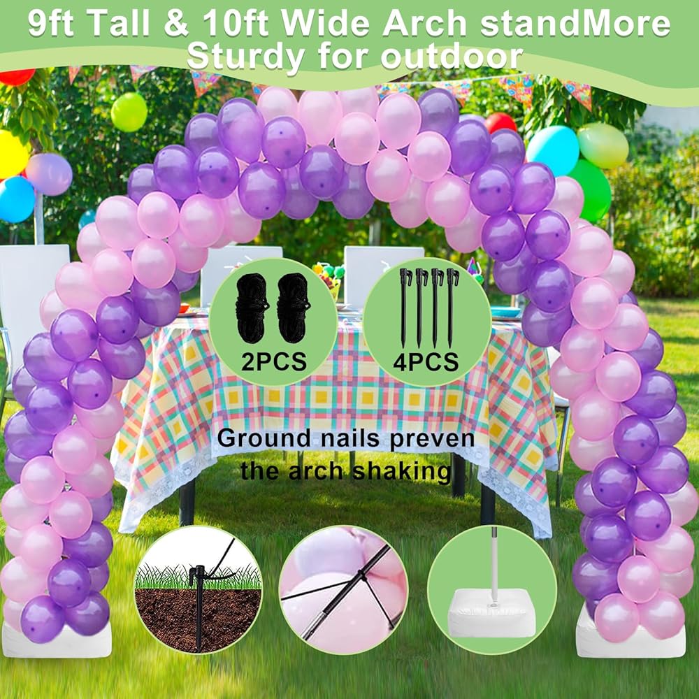 Adjustable Size & Easy Assembly: The height and width of the arch can be adjusted at will by adjusting the distance between the bases. Install this balloon arch JUST few minutes. You can also use the ground secure ropes and ground nails to fix as required