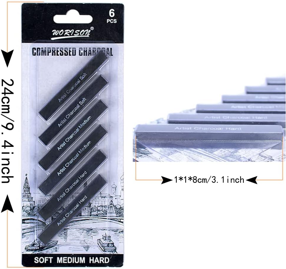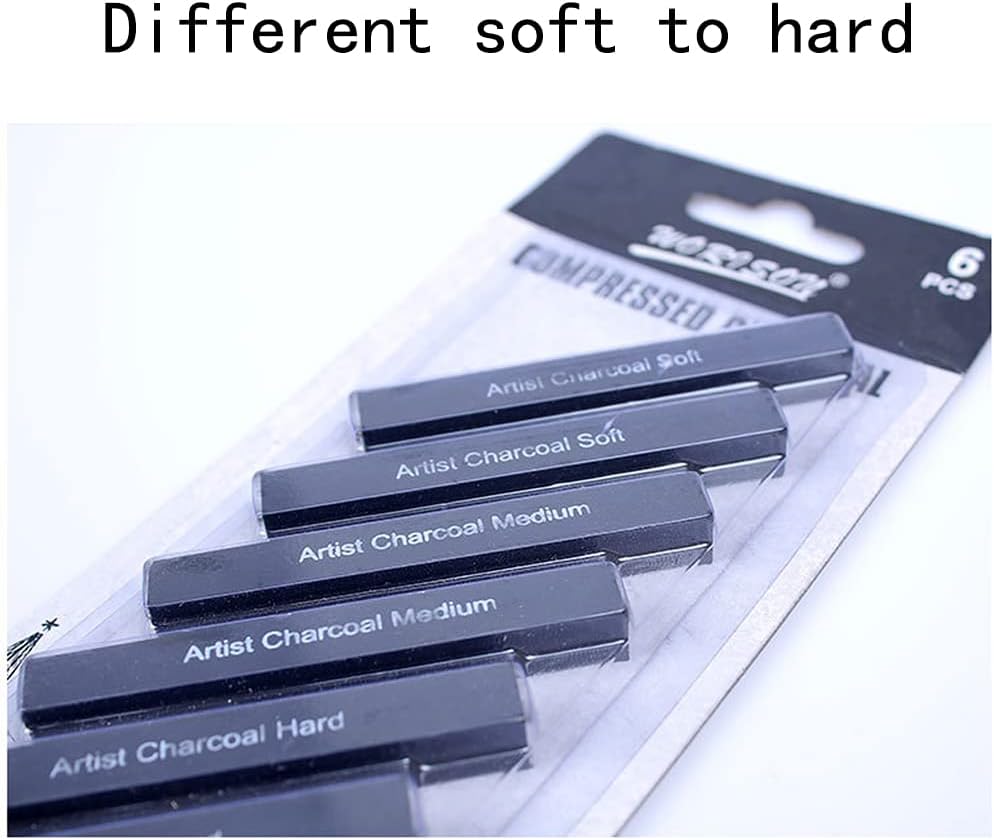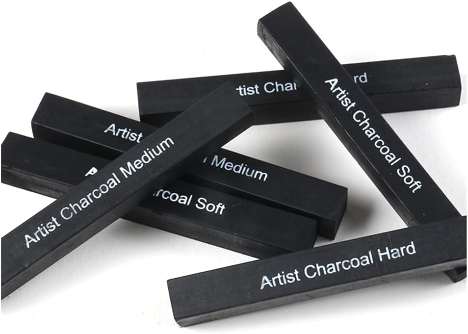عصا الفحم المضغوط BLLNDX 6 قطع ناعمة ومتوسطة وصعبة من الدرجة الكرمة مربعة الفحمي من الصفصاف للرسم والرسم والتظليل ومستلزمات الفن مجموعات رسم أدوات شريط كربون